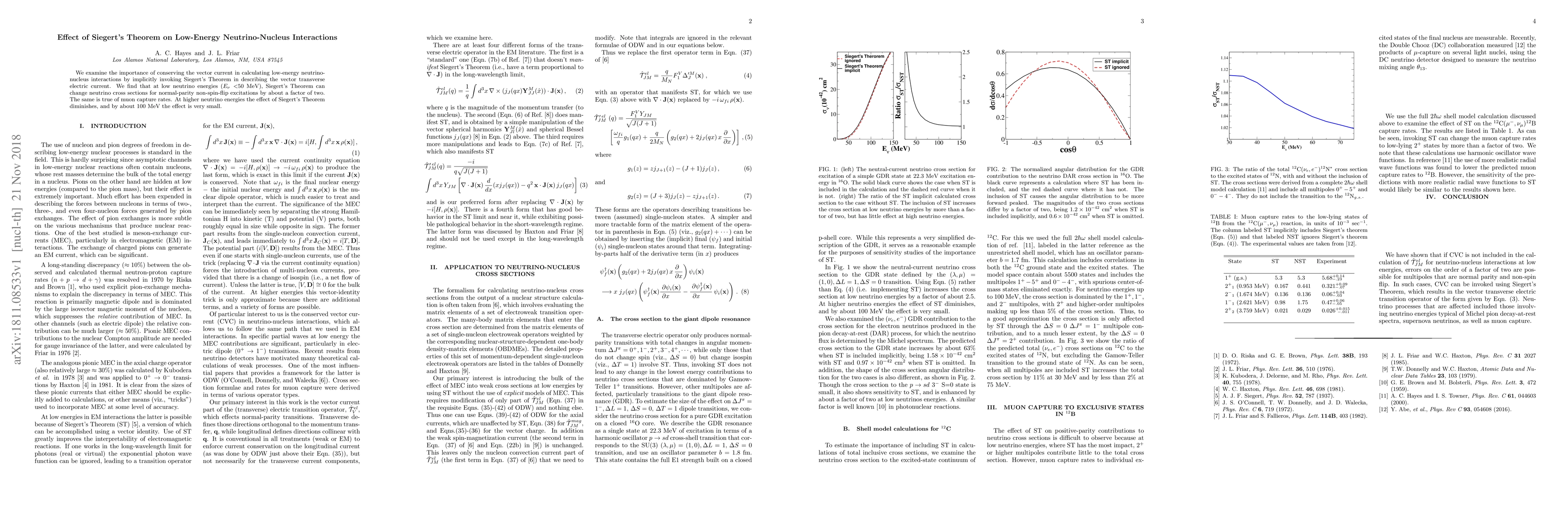 This research explores the impact of Siegert's Theorem on low-energy neutrino-nucleus interactions, finding that it can alter neutrino cross sections for specific excitations by roughly a factor of two at energies below 50 MeV. The effect lessens as neutrino energy increases.
