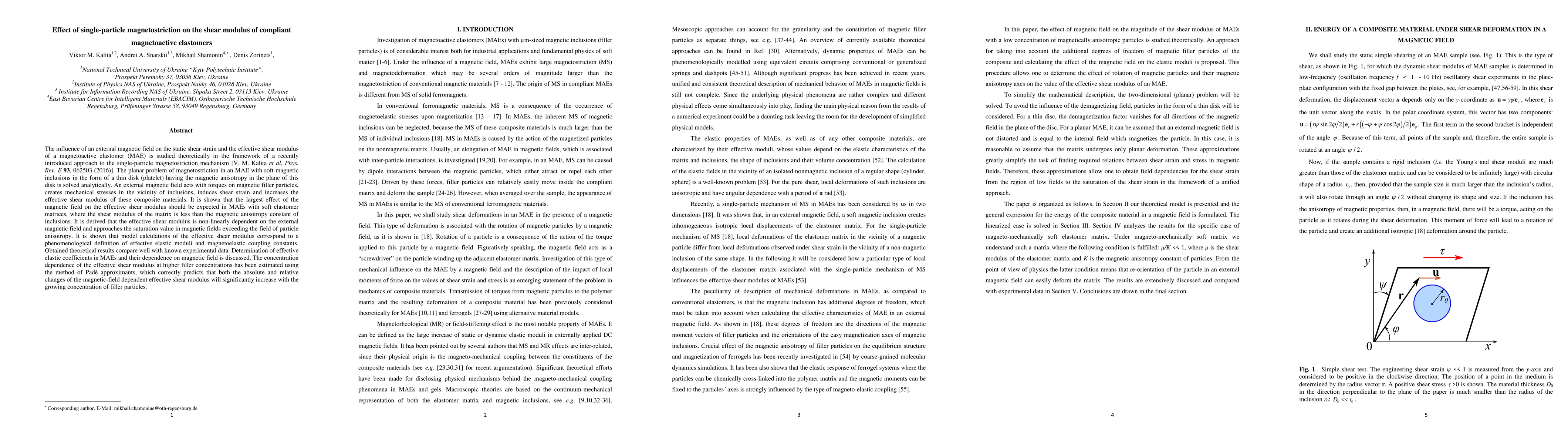 The influence of an external magnetic field on the static shear strain and the effective shear modulus of a magnetoactive elastomer (MAE) is studied theoretically in the framework of a recently introduced approach to the single-particle magnetostriction mechanism [V. M. Kalita et al, Phys. Rev. E 93, 062503 (2016)]. The planar problem of magnetostriction in an MAE with soft magnetic inclusions in the form of a thin disk (platelet) having the magnetic anisotropy in the plane of this disk is solved analytically. An external magnetic field acts with torques on magnetic filler particles, creates mechanical stresses in the vicinity of inclusions, induces shear strain and increases the effective shear modulus of these composite materials. It is shown that the largest effect of the magnetic field on the effective shear modulus should be expected in MAEs with soft elastomer matrices, where the shear modulus of the matrix is less than the magnetic anisotropy constant of inclusions. It is derived that the effective shear modulus is non-linearly dependent on the external magnetic field and approaches the saturation value in magnetic fields exceeding the field of particle anisotropy. It is shown that model calculations of the effective shear modulus correspond to a phenomenological definition of effective elastic moduli and magnetoelastic coupling constants. Obtained theoretical results compare well with known experimental data. Determination of effective elastic coefficients in MAEs and their dependence on magnetic field is discussed. The concentration dependence of the effective shear modulus at higher filler concentrations has been estimated using the method of Pad\'e approximants, which correctly predicts that both the absolute and relative changes of the magnetic-field dependent effective shear modulus will significantly increase with the growing concentration of filler particles.