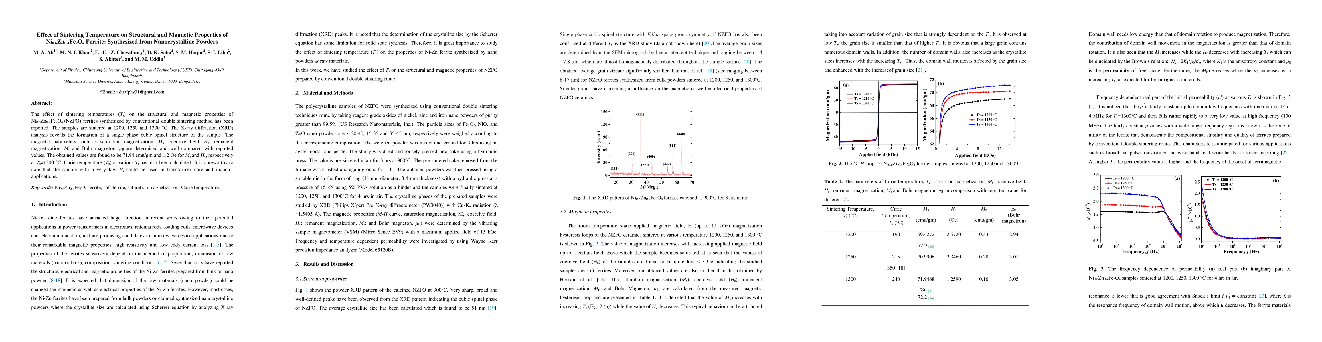This study investigates how varying sintering temperatures affect the structural and magnetic properties of Ni0.6Zn0.4Fe2O4 ferrites synthesized from nanocrystalline powders. Results show a single phase cubic spinel structure and optimal magnetic properties at 1300 °C, with high saturation magnetization and low coercive field, making it suitable for transformer core applications.