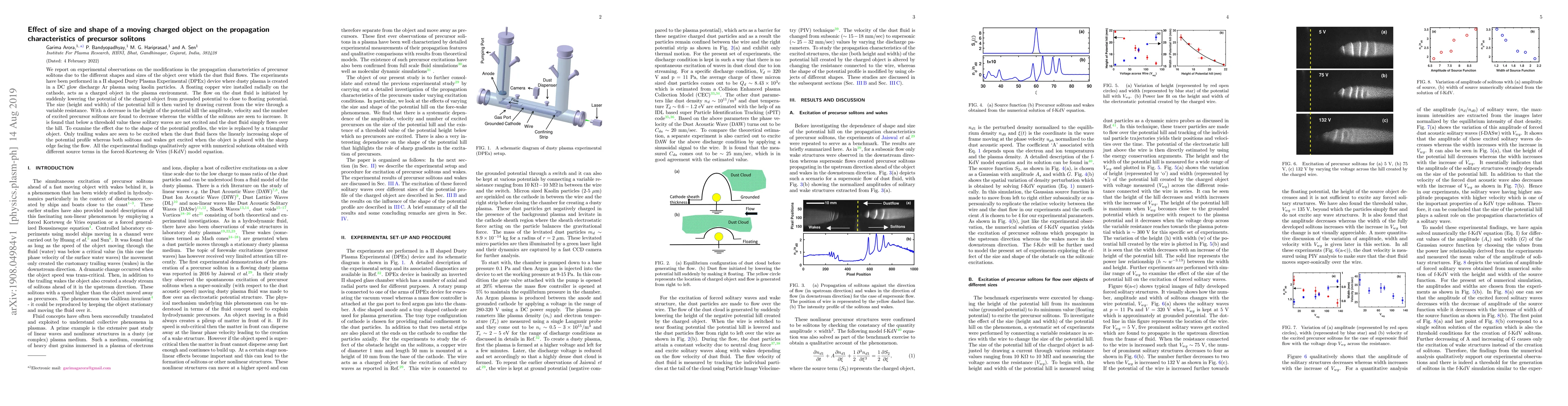 This paper investigates how varying the size and shape of a moving charged object influences the propagation characteristics of precursor solitons in a dusty plasma. Experimental results show that decreasing the height of the potential hill reduces soliton amplitude, velocity, and number, while increasing their width, and that below a threshold, no solitons form. Shape variations also affect soliton excitation, with trailing wakes forming on linear slopes and both solitons and wakes forming with sharp edges. Numerical simulations using the forced-Korteweg de Vries model support these findings.