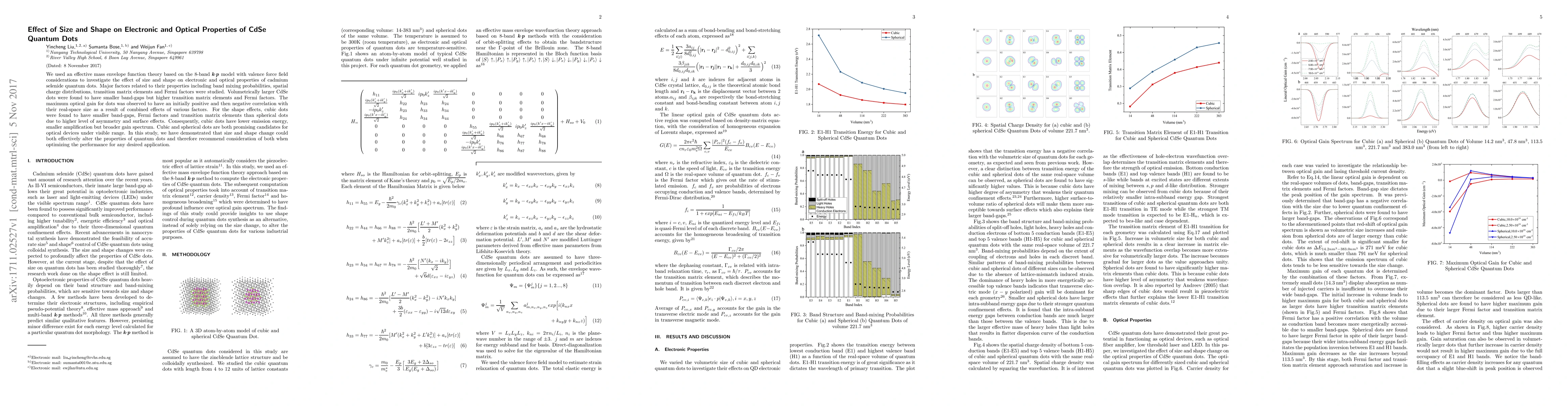 In this paper, we used the 8-band k$\cdot$p model with valence force field considerations to investigate the effect of size and shape on electronic and optical properties of cadmium selenide quantum dots. Major factors related to their properties including band mixing probabilities, spatial charge distributions, transition matrix elements and Fermi factors were studied. Volumetrically larger CdSe dots were found to have smaller band-gaps but higher transition matrix elements and Fermi factors. The maximum optical gain for dots was observed to have an initially positive and then negative correlation with their real-space size as a result of combined effects of various factors. For the shape effects, cubic dots were found to have smaller band-gaps, Fermi factors and transition matrix elements than spherical dots due to higher level of asymmetry and different surface effects. Consequently, cubic dots have lower emission energy, smaller amplification. The occurrence of near E1-H1 transition broadens the gain spectrum of cubic dots. Cubic and spherical dots are both proven to be promising candidates for optical devices under visible range. We have demonstrated that size and shape change could both effectively alter the properties of quantum dots and therefore recommend consideration of both when optimizing the performance for any desired application.