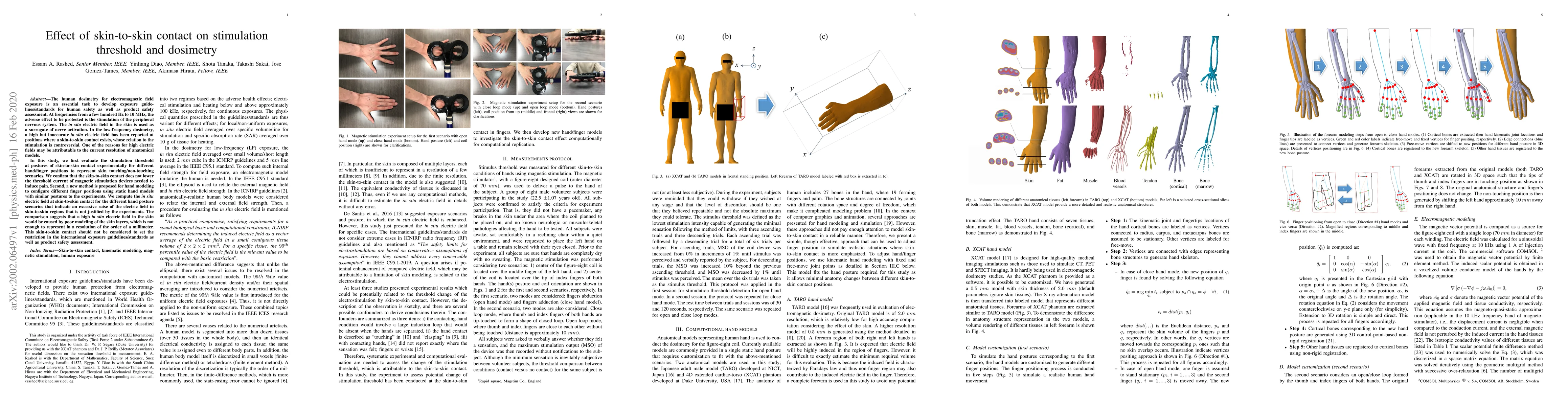 The human dosimetry for electromagnetic field exposure is an essential task to develop exposure guidelines/standards for human safety as well as product safety assessment. At frequencies from a few hundred Hz to 10 MHz, the adverse effect to be protected is the stimulation of the peripheral nervous system. The in situ electric field in the skin is used as a surrogate of nerve activation. In the low-frequency dosimetry, a high but inaccurate in situ electric field has been reported at positions where a skin-to-skin contact exists, whose relation to the stimulation is controversial. One of the reasons for high electric fields may be attributable to the current resolution of anatomical models. In this study, we first evaluate the stimulation threshold at postures of skin-to-skin contact experimentally for different hand/finger positions to represent skin touching/non-touching scenarios. We confirm that the skin-to-skin contact does not lower the threshold current of magnetic stimulation devices needed to induce pain. Second, a new method is proposed for hand modeling to configure different finger positions using static hand models with similar postures to the experiments. We compute the in situ electric field at skin-to-skin contact for the different hand posture scenarios that indicate an excessive raise of the electric field in skin-to-skin regions that is not justified by the experiments. The comparison suggests that a high in situ electric field in the skin would be caused by poor modeling of the skin layers, which is not enough to represent in a resolution of the order of a millimeter. This skin-to-skin contact should not be considered to set the restriction in the international exposure guidelines/standards as well as product safety assessment.