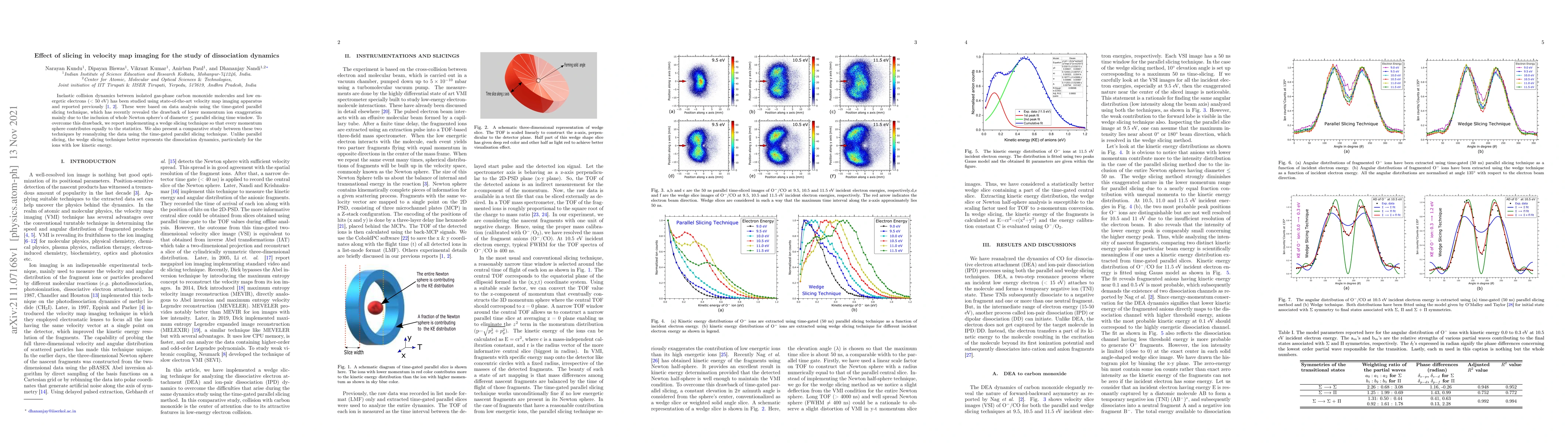 This paper investigates the dynamics of inelastic collisions between carbon monoxide molecules and low-energy electrons using velocity map imaging. It compares the traditional time-gated parallel slicing technique with the newly implemented wedge slicing technique, finding that wedge slicing provides a more accurate representation of dissociation dynamics, especially for ions with low kinetic energy.