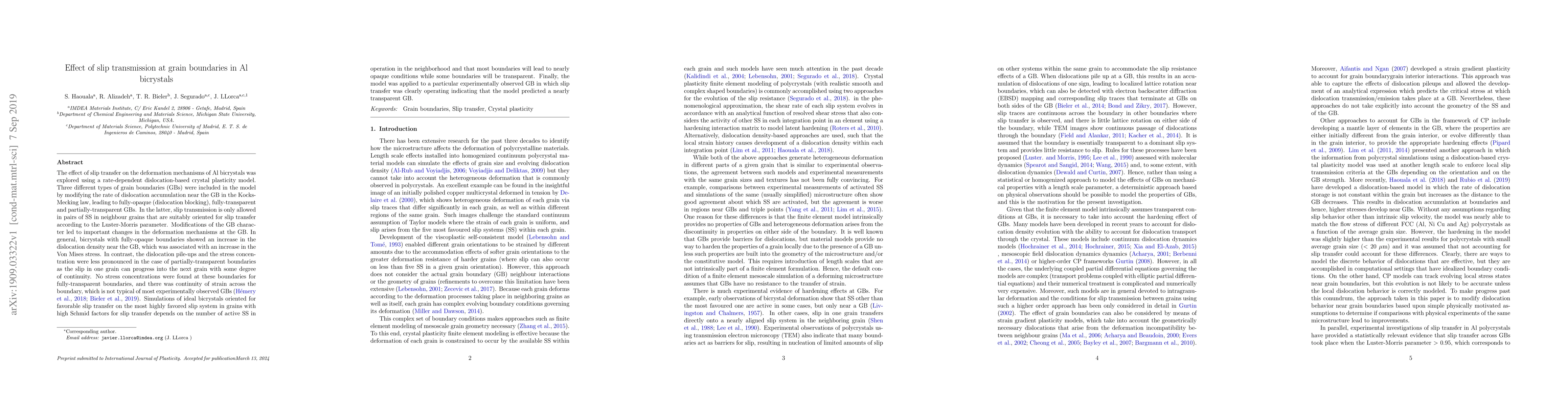 The effect of slip transfer on the deformation mechanisms of Al bicrystals was explored using a rate-dependent dislocation-based crystal plasticity model. Three different types of grain boundaries (GBs) were included in the model by modifying the rate of dislocation accumulation near the GB in the Kocks-Mecking law, leading to fully-opaque (dislocation blocking), fully-transparent and partially-transparent GBs. In the latter, slip transmission is only allowed in pairs of SS in neighbour grains that are suitably oriented for slip transfer according to the Luster-Morris parameter. Modifications of the GB character led to important changes in the deformation mechanisms at the GB. In general, bicrystals with fully-opaque boundaries showed an increase in the dislocation density near the GB, which was associated with an increase in the Von Mises stress. In contrast, the dislocation pile-ups and the stress concentration were less pronounced in the case of partially-transparent boundaries as the slip in one grain can progress into the next grain with some degree of continuity. No stress concentrations were found at these boundaries for fully-transparent boundaries, and there was continuity of strain across the boundary, which is not typical of most experimentally observed GBs. Simulations of ideal bicrystals oriented for favorable slip transfer on the most highly favored slip system in grains with high Schmid factors for slip transfer depends on the number of active SS in operation in the neighborhood and that most boundaries will lead to nearly opaque conditions while some boundaries will be transparent. Finally, the model was applied to a particular experimentally observed GB in which slip transfer was clearly operating indicating that the model predicted a nearly transparent GB.