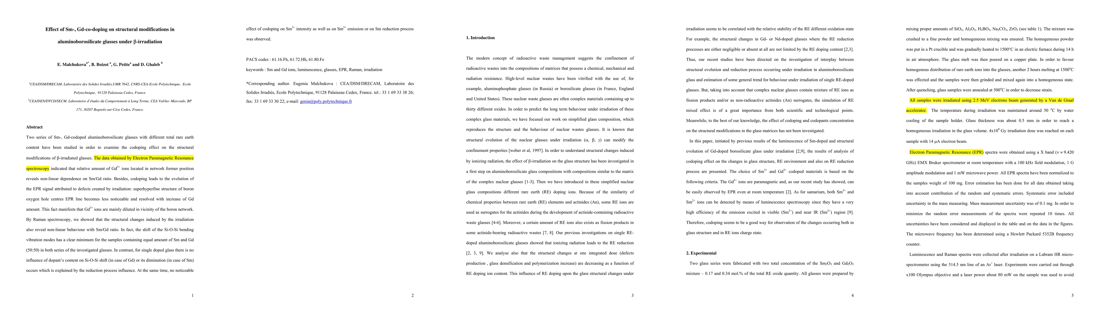 This study investigates the structural modifications in Sm-, Gd-codoped aluminoborosilicate glasses under beta-irradiation, revealing that codoping affects the distribution of Gd3+ ions and alters the EPR signal of irradiation-induced defects. The Raman spectroscopy results show non-linear behavior in structural changes, with a clear minimum shift in Si-O-Si bending modes for glasses with equal Sm and Gd content.