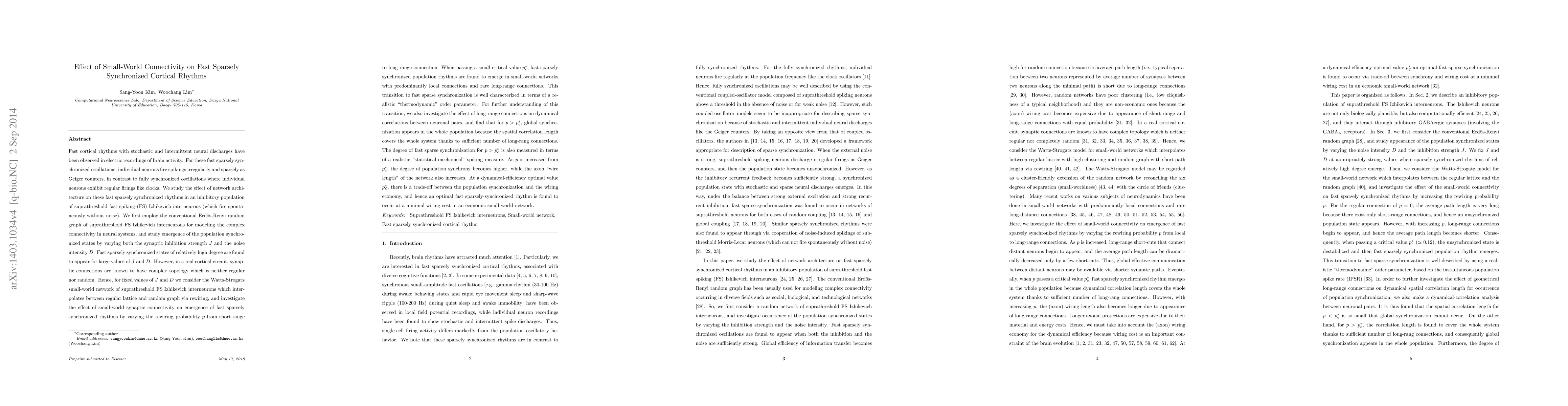 This paper investigates how small-world connectivity affects fast sparsely synchronized rhythms in inhibitory populations of fast spiking interneurons. It finds that such rhythms emerge in small-world networks with local connections and rare long-range links, transitioning from regular lattice structures when the rewiring probability exceeds a critical threshold.