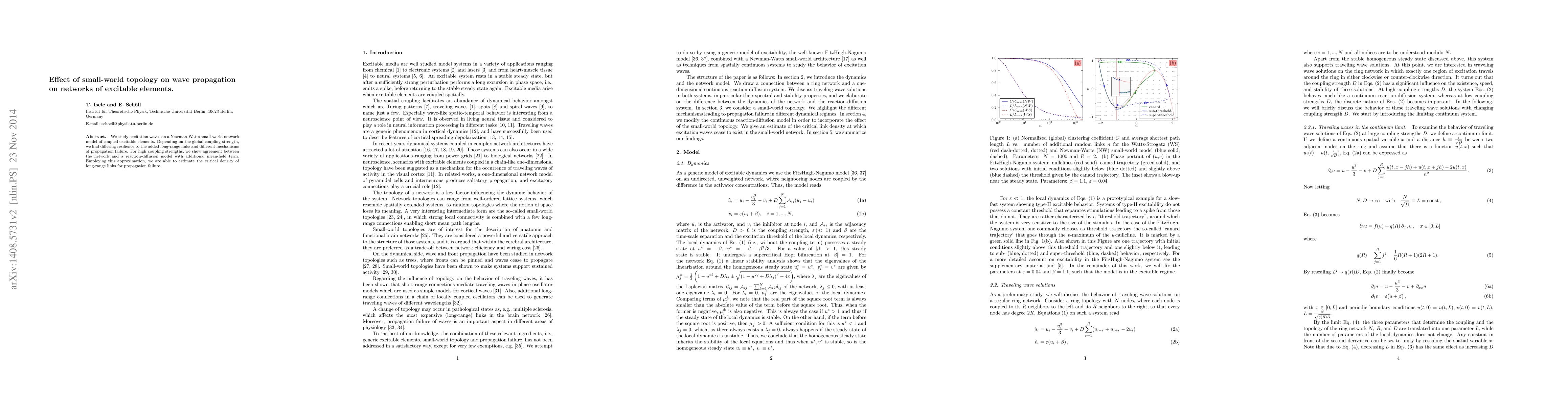 This paper investigates excitation waves on a Newman-Watts small-world network of excitable elements, revealing varied resilience and propagation failure mechanisms based on global coupling strength. High coupling strength aligns with a reaction-diffusion model, enabling the estimation of the critical density of long-range links for wave propagation failure.