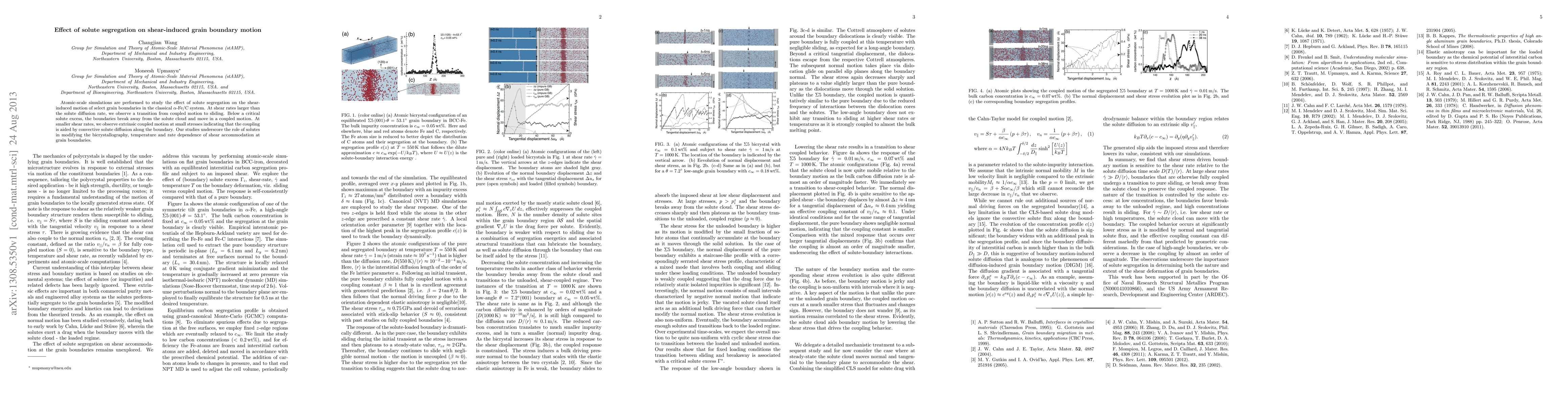 Atomic-scale simulations are performed to study the effect of solute segregation on the shear-induced motion of select grain boundaries in the classical $\alpha$-Fe/C system. At shear rates larger than the solute diffusion rate, we observe a transition from coupled motion to sliding. Below a critical solute excess, the boundaries break away from the solute cloud and move in a coupled motion. At smaller shear rates, we observe extrinsic coupled motion at small stresses indicating that the coupling is aided by convective solute diffusion along the boundary. Our studies underscore the role of solutes in modifying the bicrystallography, temperature and rate dependence of shear accommodation at grain boundaries.