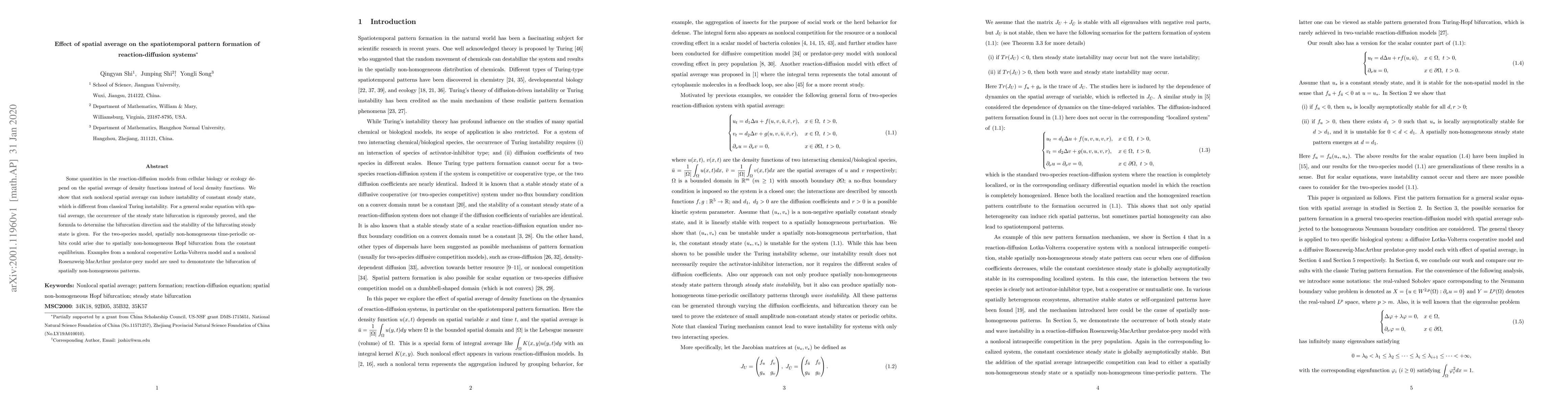 Some quantities in the reaction-diffusion models from cellular biology or ecology depend on the spatial average of density functions instead of local density functions. We show that such nonlocal spatial average can induce instability of constant steady state, which is different from classical Turing instability. For a general scalar equation with spatial average, the occurrence of the steady state bifurcation is rigorously proved, and the formula to determine the bifurcation direction and the stability of the bifurcating steady state is given. For the two-species model, spatially non-homogeneous time-periodic orbits could arise due to spatially non-homogeneous Hopf bifurcation from the constant equilibrium. Examples from a nonlocal cooperative Lotka-Volterra model and a nonlocal Rosenzweig-MacArthur predator-prey model are used to demonstrate the bifurcation of spatially non-homogeneous patterns.