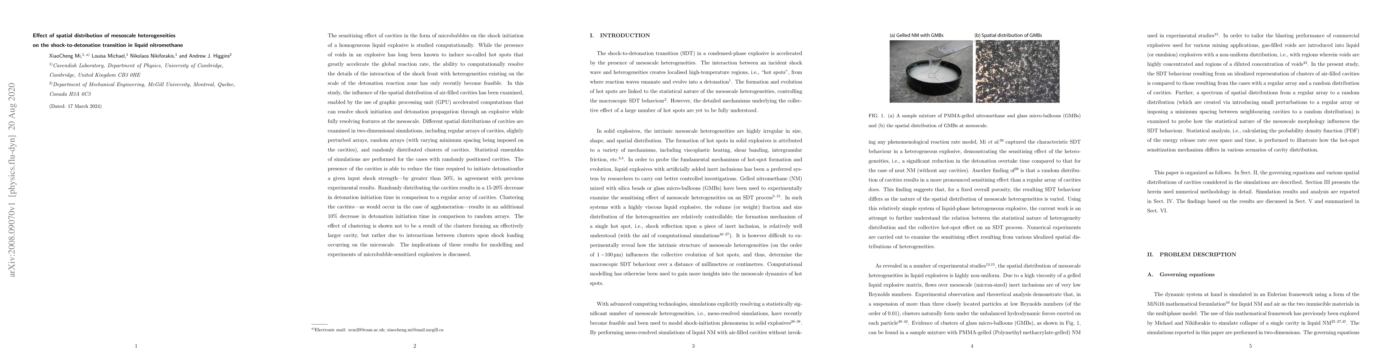 This study computationally investigates how different spatial distributions of mesoscale air-filled cavities affect the shock-to-detonation transition in liquid nitromethane. GPU-accelerated simulations reveal that cavity clustering, as opposed to regular or random distributions, significantly reduces the initiation time for detonation, highlighting the importance of microscale interactions.