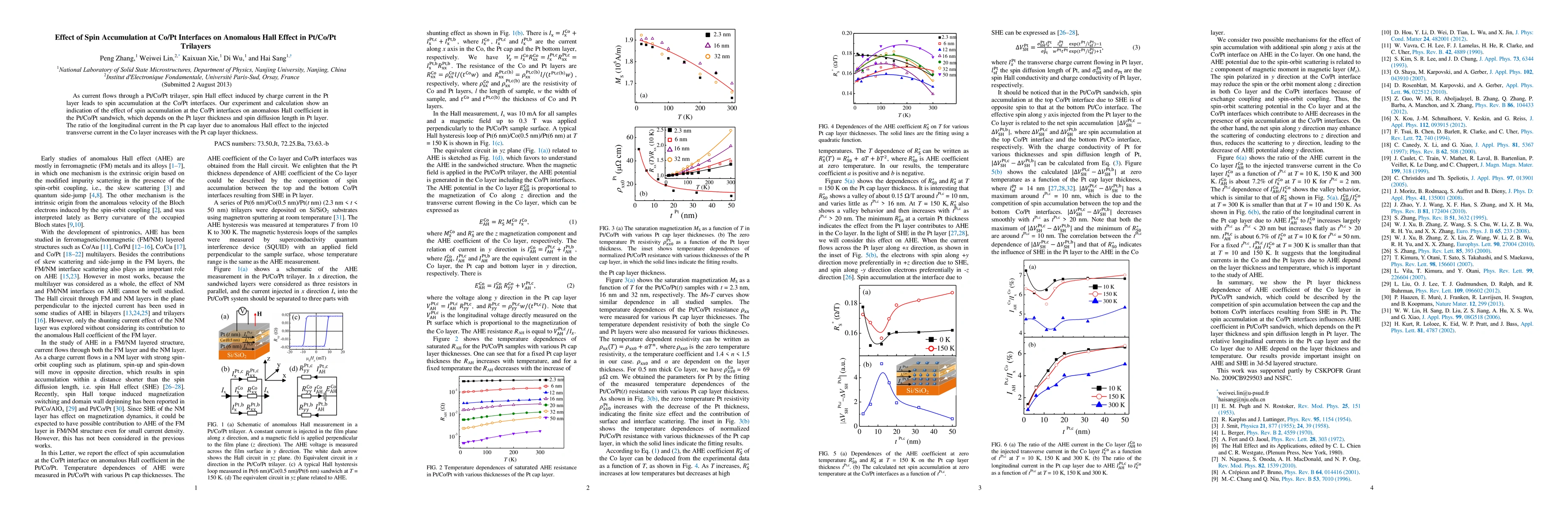 This research investigates how spin accumulation at Co/Pt interfaces affects the anomalous Hall effect in Pt/Co/Pt trilayers, revealing a dependency on Pt layer thickness and spin diffusion length. The study finds that the ratio of longitudinal current due to the anomalous Hall effect to transverse current in the Co layer increases with increasing Pt cap layer thickness.