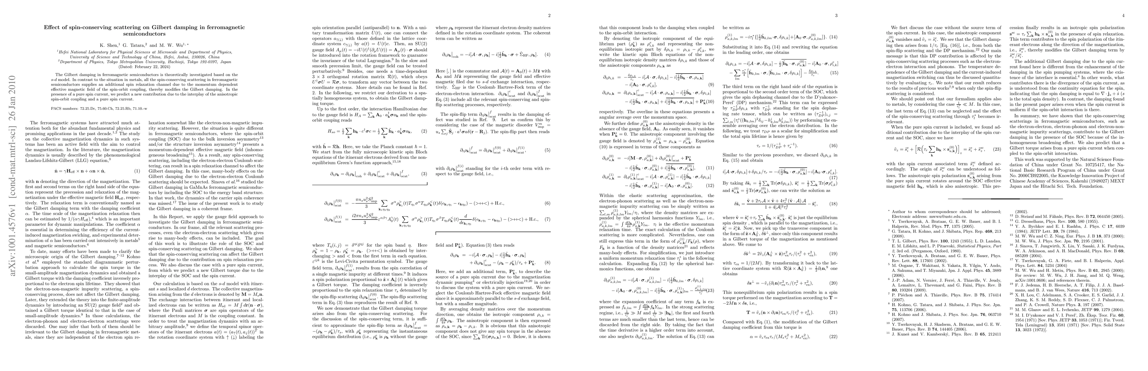 Summary: The study investigates how spin-conserving scattering influences Gilbert damping in ferromagnetic semiconductors, finding that it introduces an additional spin relaxation channel, thus modifying the damping. A new contribution to damping is predicted due to the interaction between anisotropic spin-orbit coupling and pure spin current.