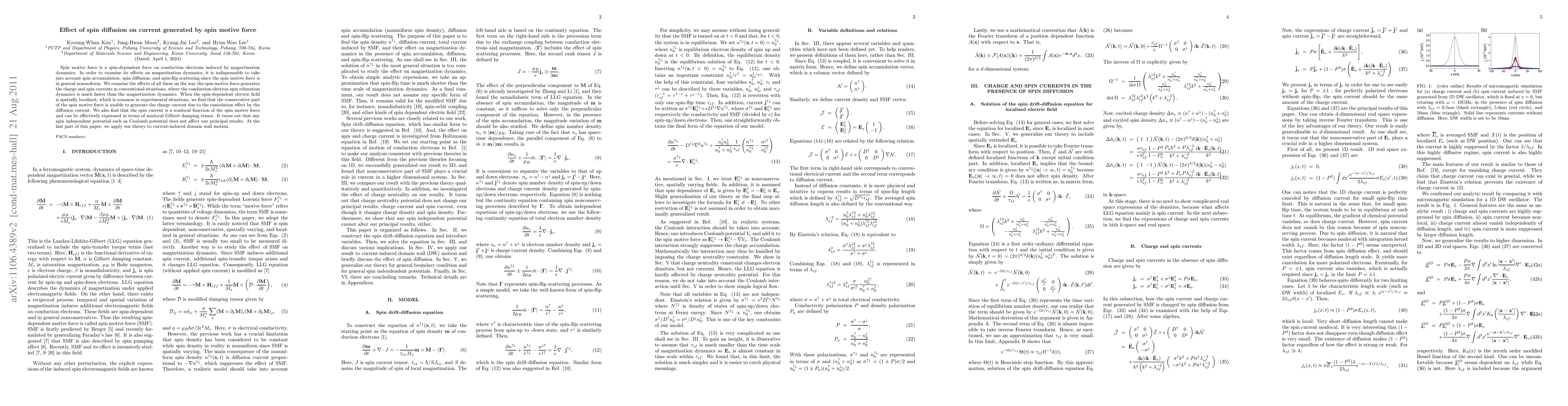 Spin motive force is a spin-dependent force on conduction electrons induced by magnetization dynamics. In order to examine its effects on magnetization dynamics, it is indispensable to take into account spin accumulation, spin diffusion, and spin-flip scattering since the spin motive force is in general nonuniform. We examine the effects of all these on the way the spin motive force generates the charge and spin currents in conventional situations, where the conduction electron spin relaxation dynamics is much faster than the magnetization dynamics. When the spin-dependent electric field is spatially localized, which is common in experimental situations, we find that the conservative part of the spin motive force is unable to generate the charge current due to the cancelation effect by the diffusion current. We also find that the spin current is a nonlocal function of the spin motive force and can be effectively expressed in terms of nonlocal Gilbert damping tensor. It turns out that any spin independent potential such as Coulomb potential does not affect our principal results. At the last part of this paper, we apply our theory to current-induced domain wall motion.