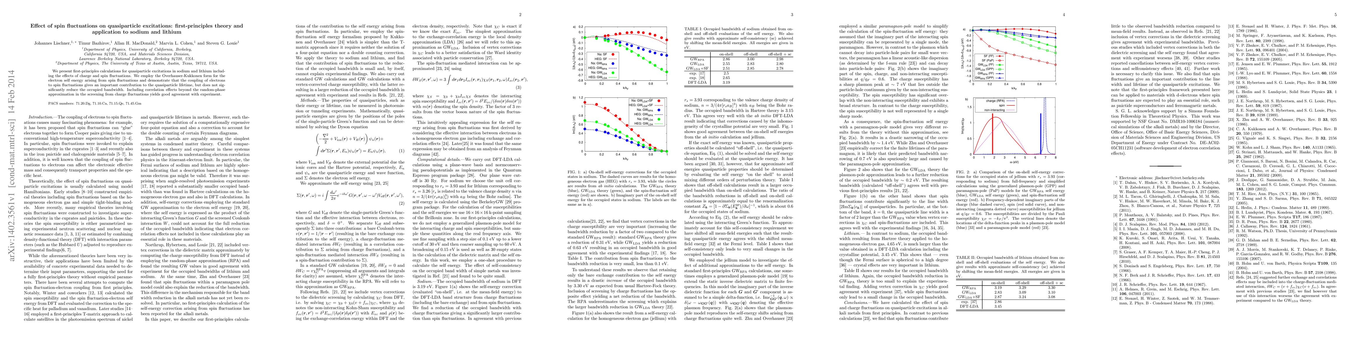 We present first-principles calculations for quasiparticle excitations in sodium and lithium including the effects of charge and spin fluctuations. We employ the Overhauser-Kukkonen form for the electron self energy arising from spin fluctuations and demonstrate that the coupling of electrons to spin fluctuations gives an important contribution to the quasiparticle lifetime, but does not significantly reduce the occupied bandwidth. Including correlation effects beyond the random-phase approximation in the screening from charge fluctuations yields good agreement with experiment.