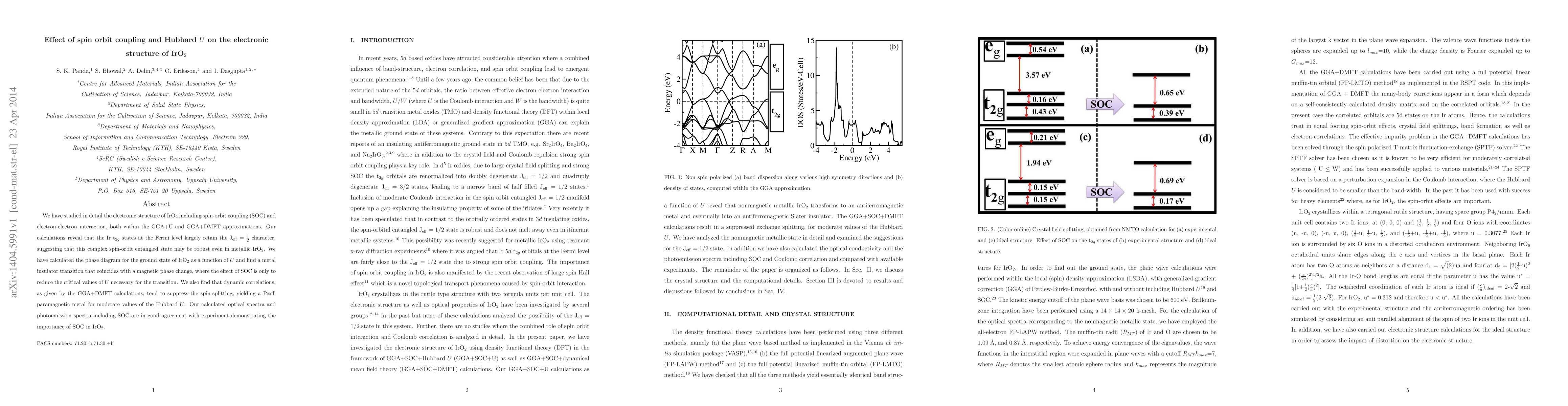 This study investigates the electronic structure of IrO2, finding that spin-orbit coupling and Hubbard U influence its metal-insulator transition and magnetic behavior, with dynamic correlations suppressing spin-splitting for moderate values of U.