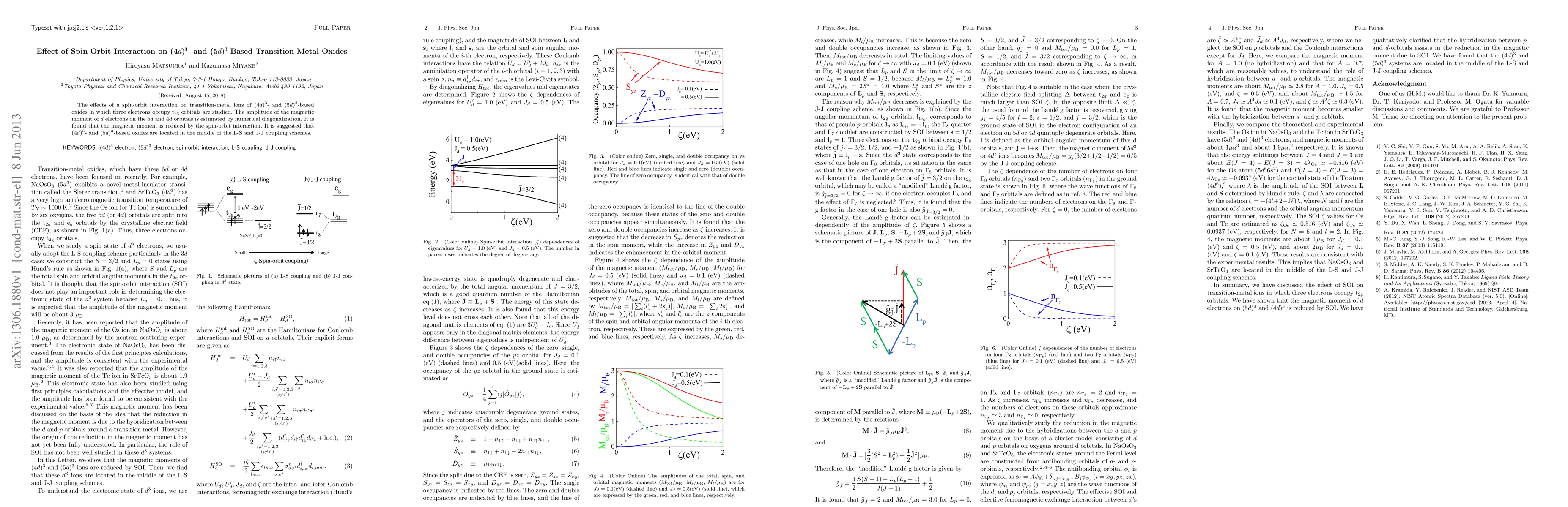 The effects of a spin-orbit interaction on transition-metal ions of (4d)^3- and (5d)^3 -based oxides in which three electrons occupy t_{2g} orbitals are studied. The amplitude of the magnetic moment of d electrons on the 5d and 4d orbitals is estimated by numerical diagonalization. It is found that the magnetic moment is reduced by the spin-orbit interaction. It is suggested that (4d)^3- and (5d)^3 -based oxides are located in the middle of the L-S and J-J coupling schemes.
