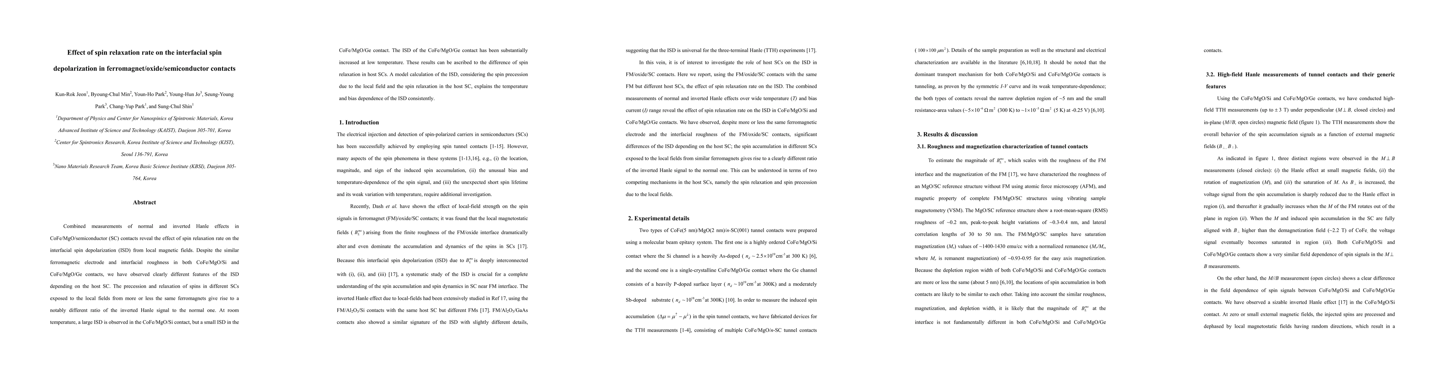 This paper investigates the effect of spin relaxation rate on interfacial spin depolarization in ferromagnet/oxide/semiconductor contacts, finding that different host semiconductors exhibit varying spin depolarization despite similar ferromagnetic electrodes and interfacial roughness. The study reveals a significant difference in the ratio of inverted to normal Hanle signals, with large spin depolarization in CoFe/MgO/Si at room temperature and minimal in CoFe/MgO/Ge, which increases at low temperatures. The findings are explained by differences in spin relaxation in the host semiconductors.