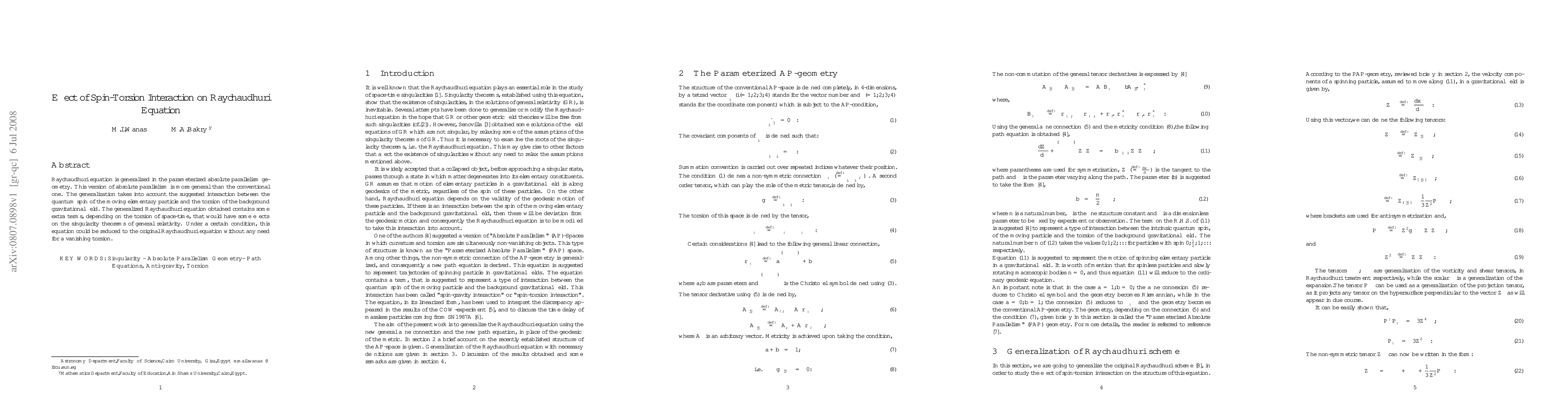 This paper generalizes the Raychaudhuri equation to account for spin-torsion interactions in a parameterized absolute parallelism geometry, introducing extra terms dependent on space-time torsion that may affect singularity theorems in general relativity. The generalized equation can revert to the original form under specific conditions.