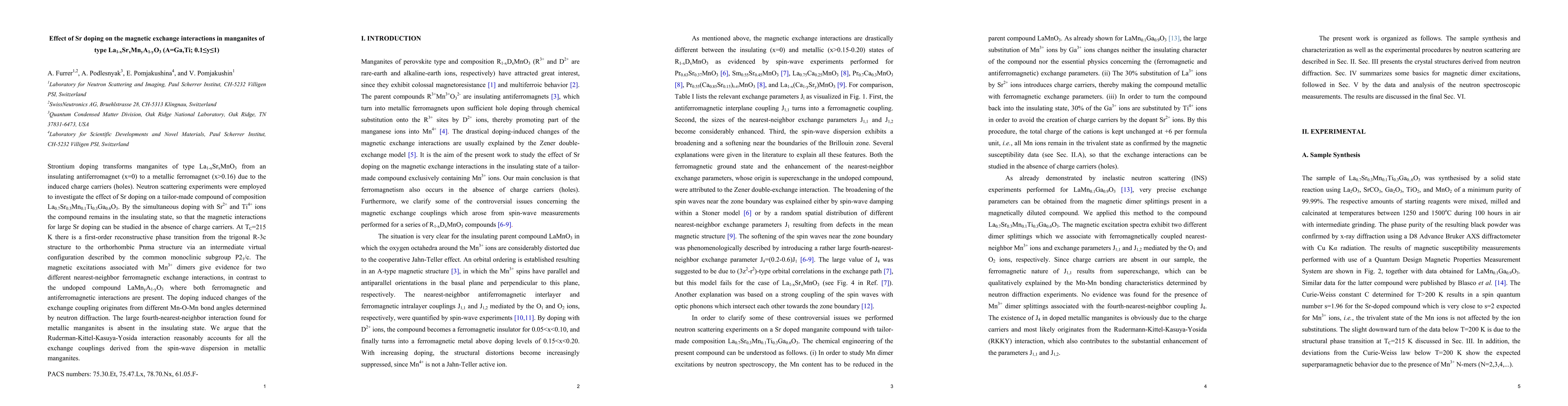 Sr doping in manganites transforms La(1-x)Sr(x)MnO(3) from insulating antiferromagnet to metallic ferromagnet, with neutron scattering revealing distinct ferromagnetic exchange interactions in doped compounds. The study of Sr and Ti co-doped manganites shows that magnetic interactions differ significantly from undoped compounds, with the Ruderman-Kittel-Kasuya-Yosida interaction explaining metallic manganite exchange couplings.