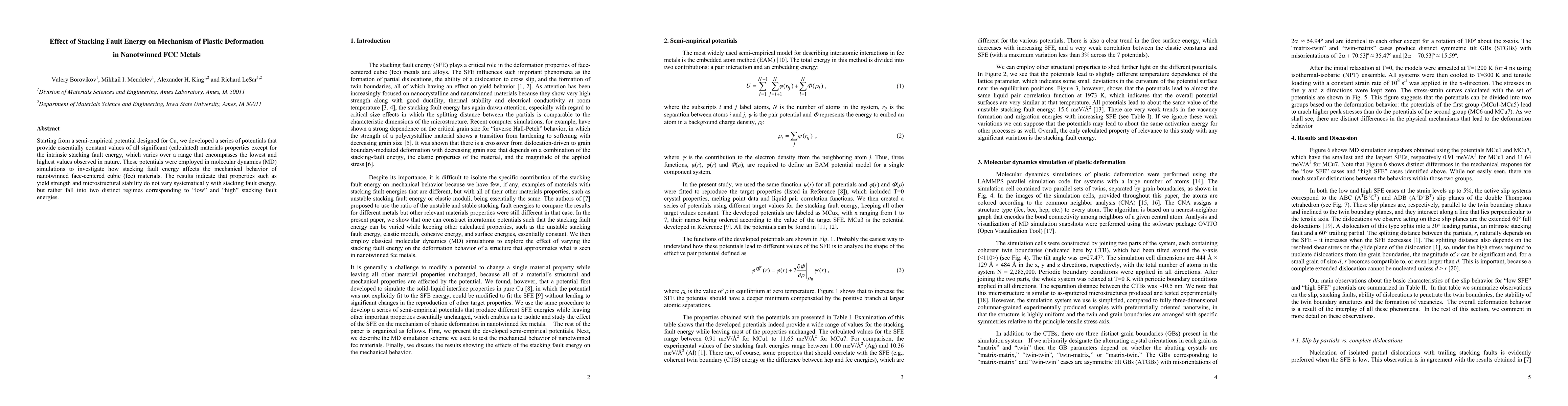 Summary: Molecular dynamics simulations using semi-empirical potentials for Cu reveal that the mechanical behavior of nanotwinned FCC metals does not exhibit systematic variation with stacking fault energy; instead, it falls into two distinct regimes based on low and high stacking fault energy values, affecting yield strength and microstructural stability.