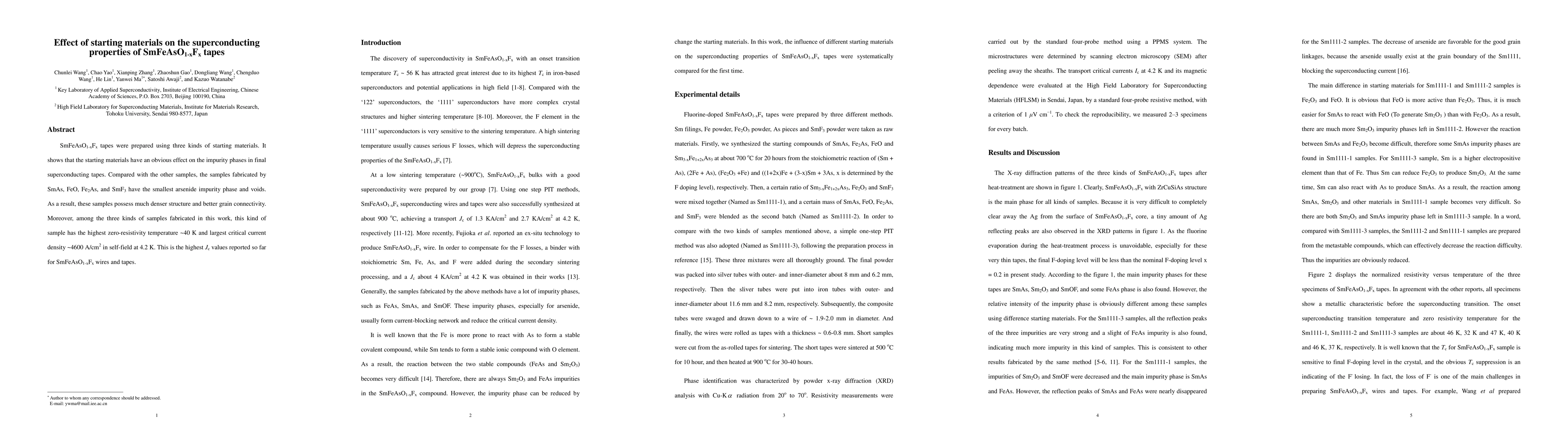 This study investigates the impact of different starting materials on the superconducting properties of SmFeAsO1-xFx tapes, finding that those made from SmAs, FeO, Fe2As, and SmF3 exhibit the least impurity phases and voids, resulting in higher zero-resistivity temperature (~40 K) and critical current density (~4600 A/cm^2) compared to other samples.