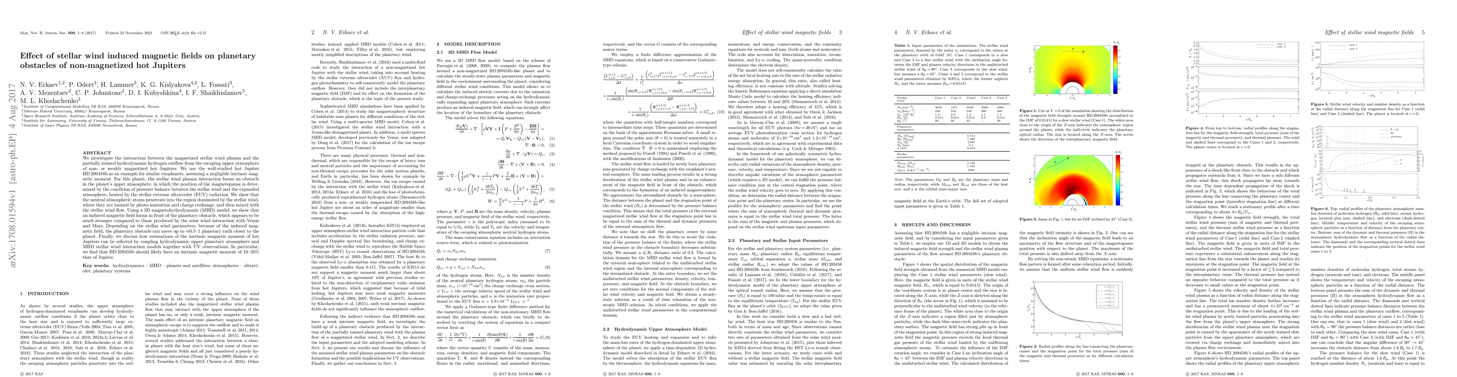 This paper examines the interaction between stellar wind plasma and the upper atmosphere of non-magnetized hot Jupiters, showing that an induced magnetic field forms in front of the planetary obstacle, potentially moving it closer to the planet. The study suggests that HD 209458b likely possesses an intrinsic magnetic moment of 10-20% that of Jupiter.