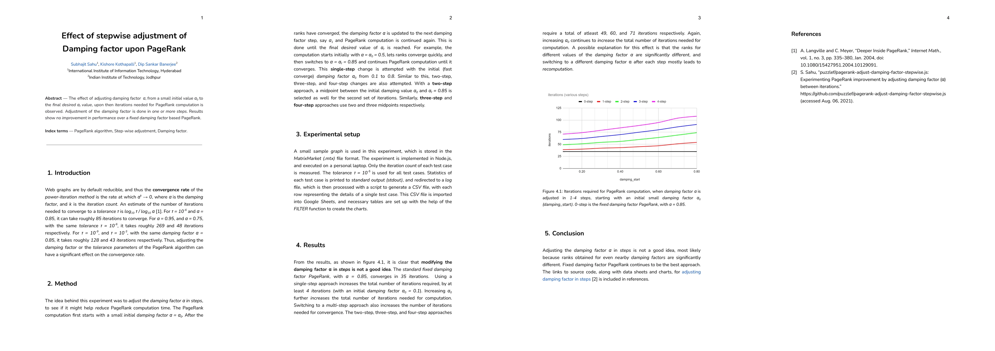 Summary: This study investigates the impact of stepwise adjustments to the damping factor on PageRank computation time, finding that such incremental changes do not enhance performance compared to using a fixed damping factor.