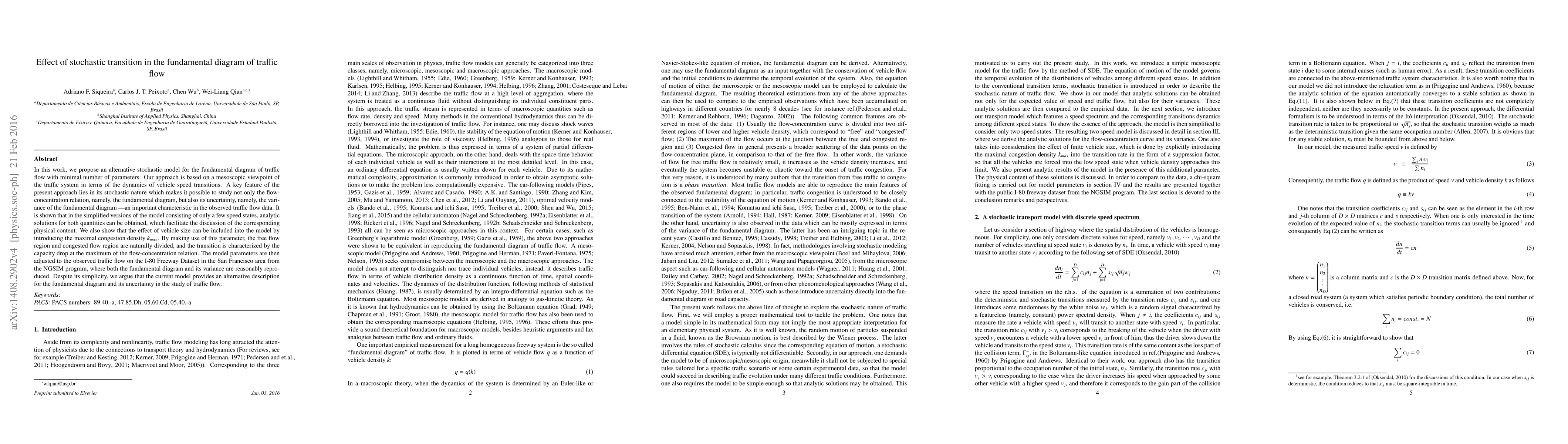 This paper proposes a stochastic model for the fundamental diagram of traffic flow, focusing on vehicle speed transitions and incorporating uncertainty through variance. The model, which includes vehicle size effects, is validated against real traffic data from the I-80 Freeway in San Francisco, demonstrating its ability to accurately reproduce both the fundamental diagram and its variance.
