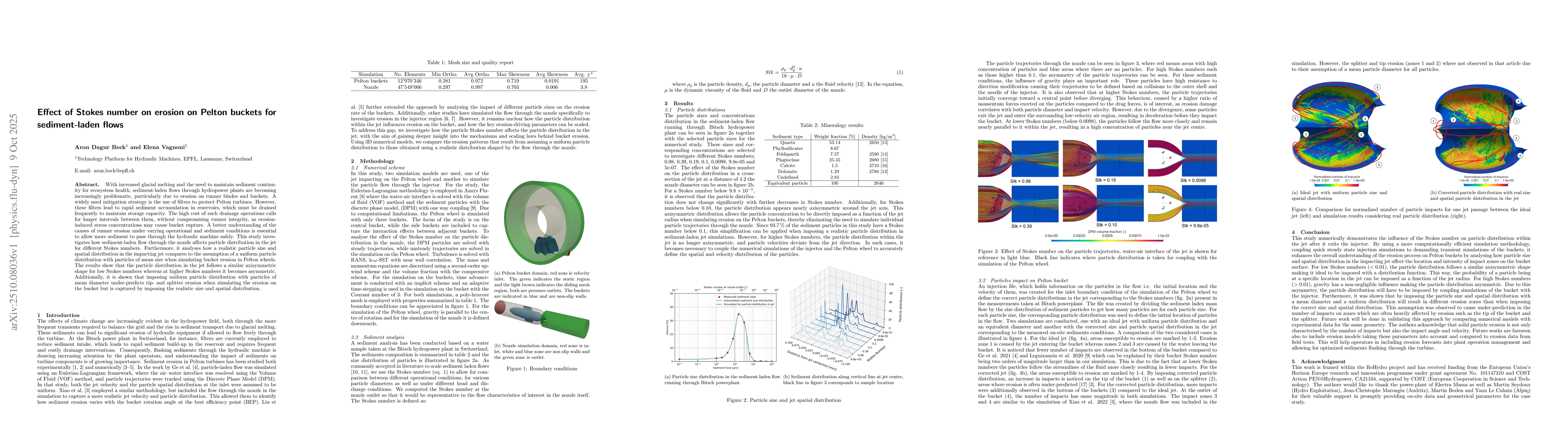 The study employed 3D numerical models using the Eulerian-Lagrangian methodology in ANSYS Fluent, combining the Volume of Fluid (VOF) method for water-air interface and Discrete Phase Model (DPM) for sediment particles. Simulations focused on three buckets of a Pelton wheel, with emphasis on the central bucket, while side buckets were included to capture interaction effects. The Stokes number was used to characterize particle behavior under varying flow conditions.