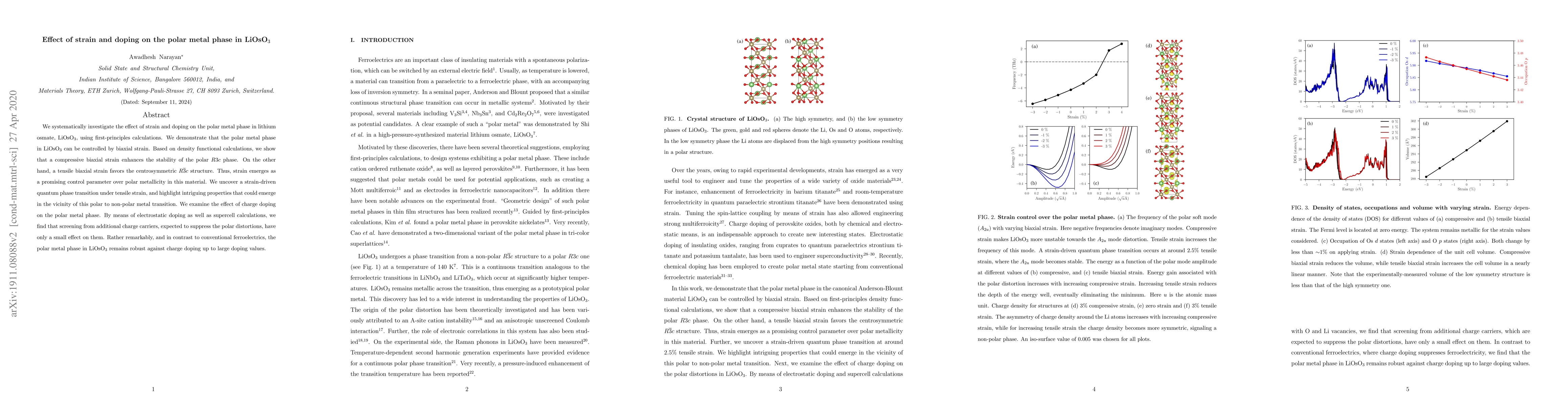 We systematically investigate the effect of strain and doping on the polar metal phase in lithium osmate, LiOsO$_3$, using first-principles calculations. We demonstrate that the polar metal phase in LiOsO$_3$ can be controlled by biaxial strain. Based on density functional calculations, we show that a compressive biaxial strain enhances the stability of the polar $R3c$ phase. On the other hand, a tensile biaxial strain favors the centrosymmetric $R\overline{3}c$ structure. Thus, strain emerges as a promising control parameter over polar metallicity in this material. We uncover a strain-driven quantum phase transition under tensile strain, and highlight intriguing properties that could emerge in the vicinity of this polar to non-polar metal transition. We examine the effect of charge doping on the polar metal phase. By means of electrostatic doping as well as supercell calculations, we find that screening from additional charge carriers, expected to suppress the polar distortions, have only a small effect on them. Rather remarkably, and in contrast to conventional ferroelectrics, the polar metal phase in LiOsO$_3$ remains robust against charge doping up to large doping values.