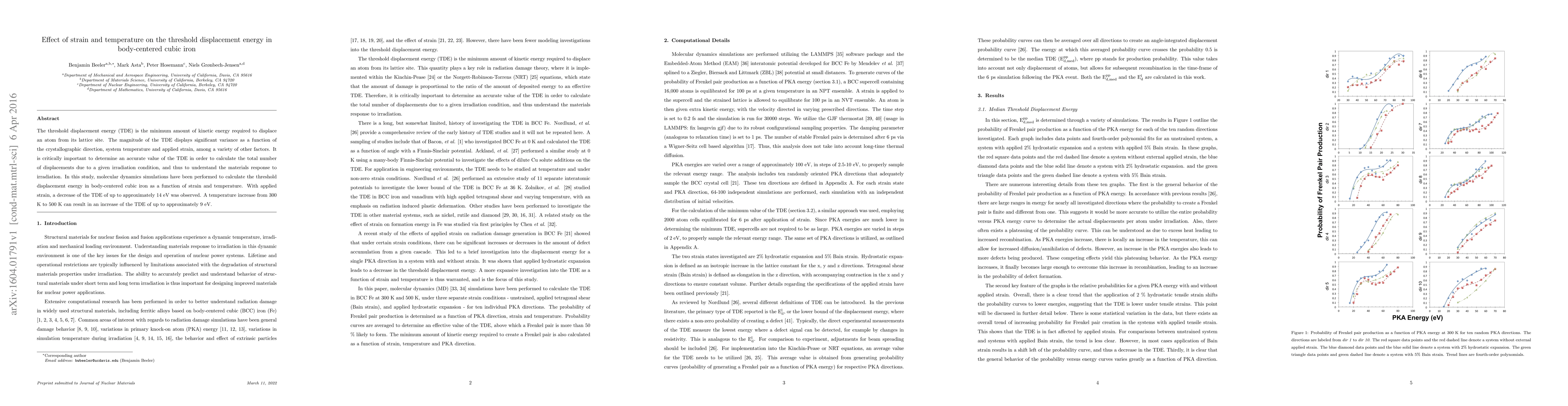 This study uses molecular dynamics simulations to determine how strain and temperature affect the threshold displacement energy (TDE) in body-centered cubic iron. The TDE decreases with applied strain and increases with temperature, highlighting their significant impact on material response to irradiation.