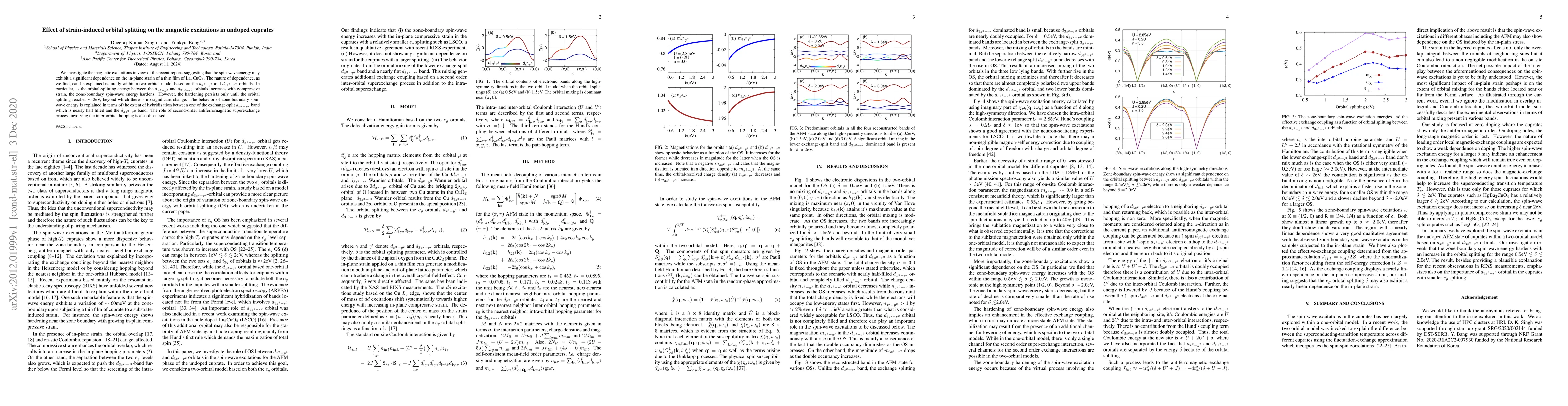 Researchers investigated how strain affects magnetic excitations in undoped cuprates, finding that increased orbital splitting leads to hardened spin-wave energy until it reaches 2eV, after which there is no significant change.
