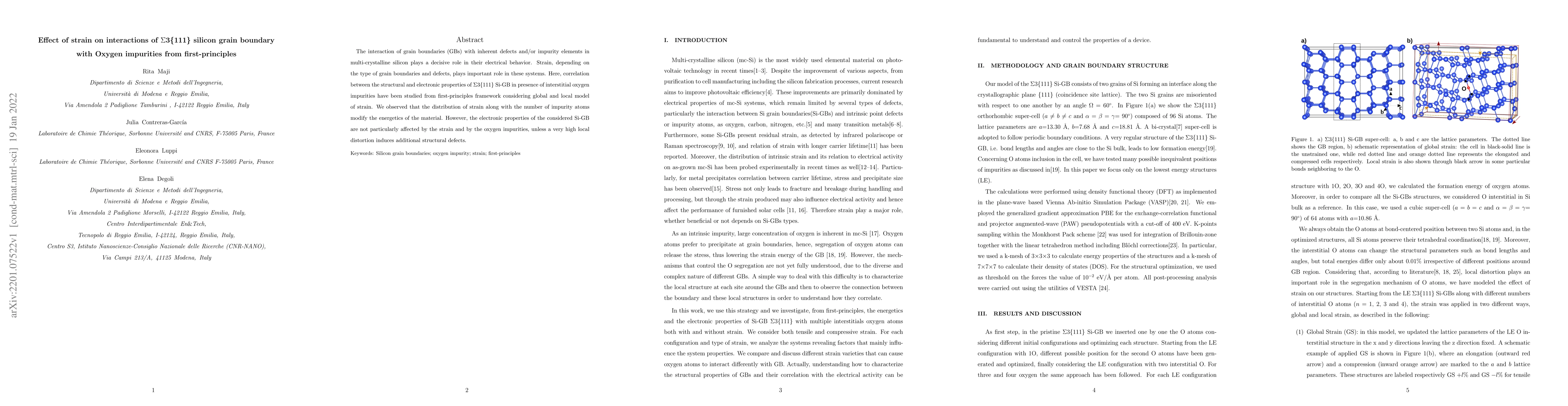 The interaction of grain boundaries (GBs) with inherent defects and/or impurity elements in multi-crystalline silicon play a decisive role in their electrical behavior. Strain, depending on the types of GBs and defects, plays an important role in these systems. Herein, the correlation between the structural and electronic properties of {\Sigma} 3{111} Si-GB in the presence of interstitial oxygen impurities is studied from the first-principles framework, considering the global and local model of strain. It is observed that the distribution of strain along with the number of impurity atoms modifies the energetics of the material. However, the electronic properties of the considered Si-GBs are not particularly affected by the strain and by the oxygen impurities, unless a very high local distortion induces additional structural defects.