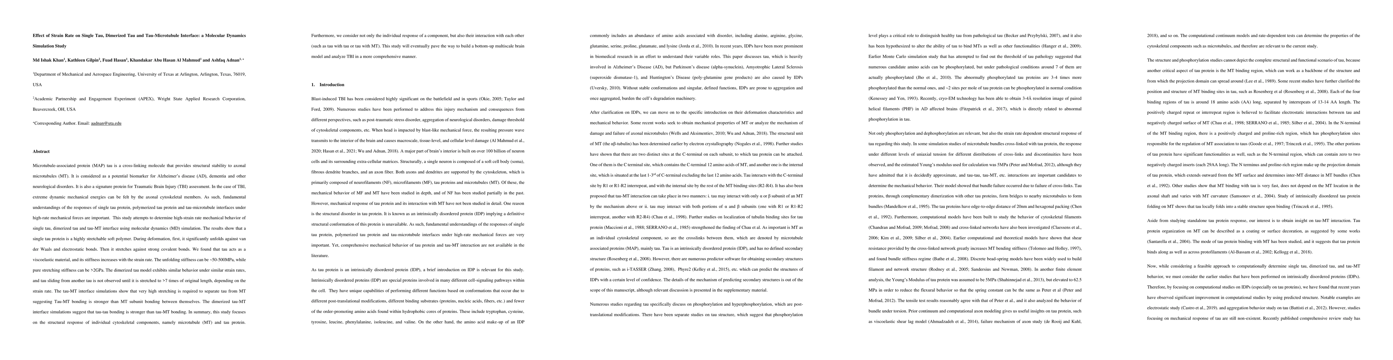 A molecular dynamics simulation study investigated how high strain rates affect single tau, dimerized tau, and tau-microtubule interfaces, revealing insights into the mechanical behavior of tau under rapid deformation.