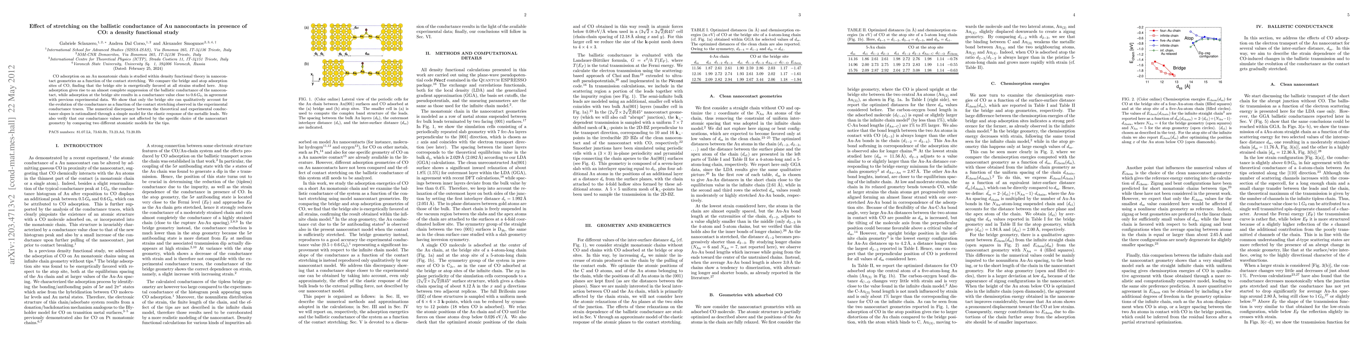 CO adsorption on an Au monatomic chain is studied within density functional theory in nanocontact geometries as a function of the contact stretching. We compare the bridge and atop adsorption sites of CO, finding that the bridge site is energetically favored at all strains studied here. Atop adsorption gives rise to an almost complete suppression of the ballistic conductance of the nanocontact, while adsorption at the bridge site results in a conductance value close to 0.6 G0, in agreement with previous experimental data. We show that only the bridge site can qualitatively account for the evolution of the conductance as a function of the contact stretching observed in the experimental conductance traces. The numerical discrepancy between the theoretical and experimental conductance slopes is rationalized through a simple model for the elastic response of the metallic leads. We also verify that our conductance values are not affected by the specific choice of the nanocontact geometry by comparing two different atomistic models for the tips.