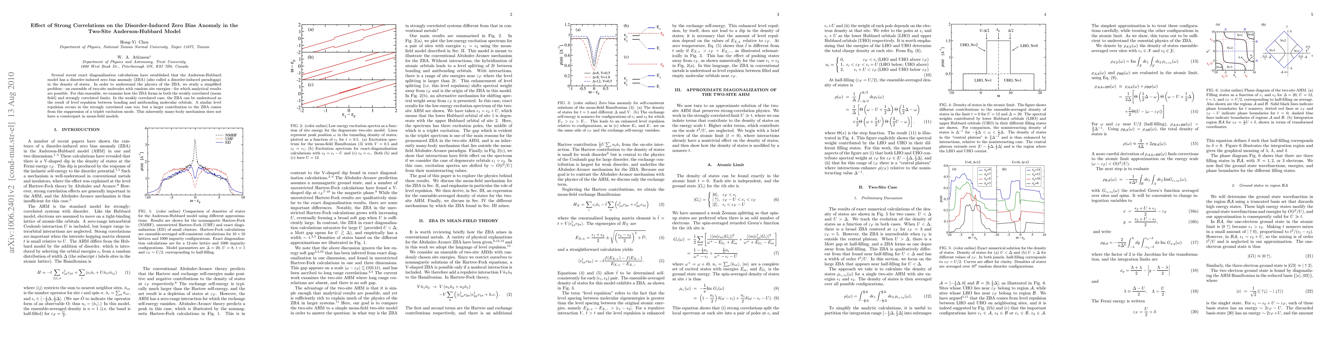 This paper investigates the disorder-induced zero bias anomaly (ZBA) in the two-site Anderson-Hubbard model, showing that while level repulsion explains the ZBA in weakly correlated systems, strong correlations additionally suppress triplet excitations, a many-body effect absent in mean-field models.