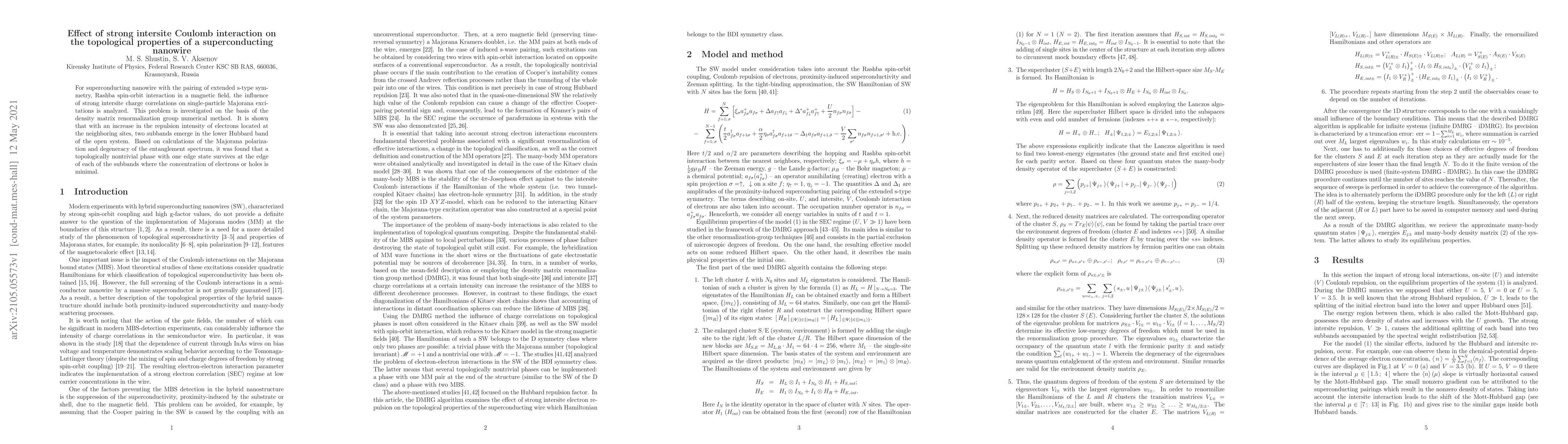 For superconducting nanowire with the pairing of extended s-type symmetry, Rashba spin-orbit interaction in a magnetic field, the influence of strong intersite charge correlations on single-particle Majorana excitations is analyzed. This problem is investigated on the basis of the density matrix renormalization group numerical method. It is shown that with an increase in the repulsion intensity of electrons located at the neighboring sites, two subbands emerge in the lower Hubbard band of the open system. Based on calculations of the Majorana polarization and degeneracy of the entanglement spectrum, it was found that a topologically nontrivial phase with one edge state survives at the edge of each of the subbands where the concentration of electrons or holes is minimal.