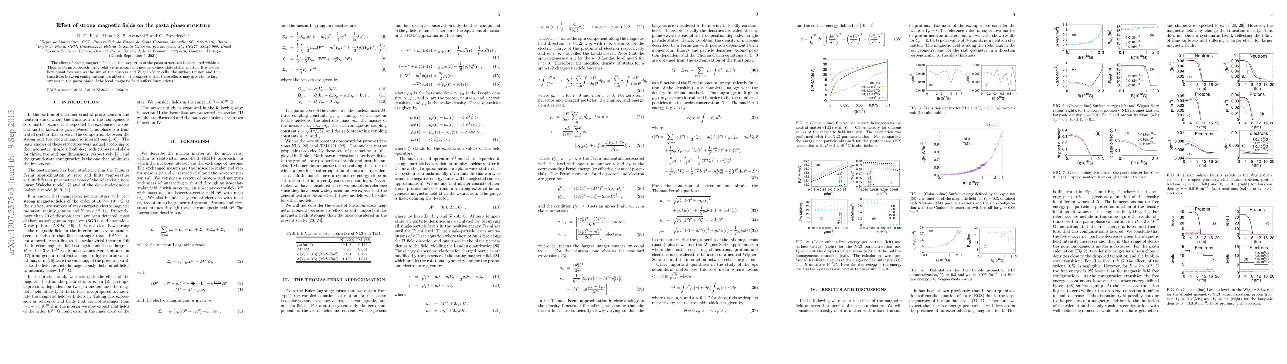 The effect of strong magnetic fields on the properties of the pasta structures is calculated within a Thomas Fermi approach using relativistic mean field models to modulate stellar matter. It is shown how quantities such as the size of the clusters and Wigner-Seitz cells, the surface tension and the transition between configurations are affected. It is expected that these effects may give rise to large stresses in the pasta phase if the local magnetic field suffers fluctuations.