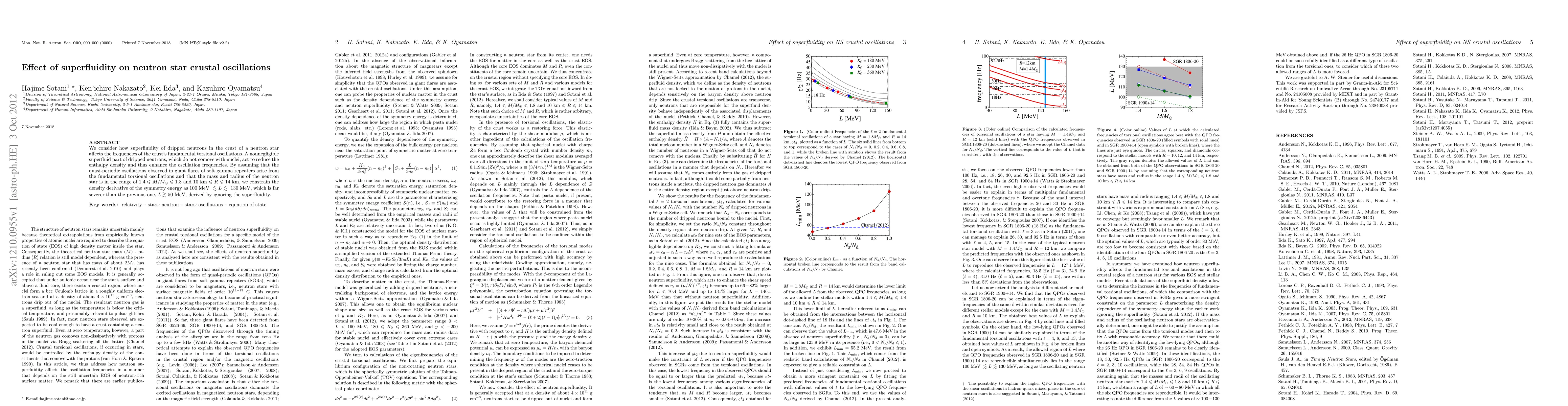This paper investigates how superfluidity in neutron star crusts influences the frequencies of fundamental torsional oscillations, finding that superfluid neutrons enhance these frequencies. The study constrains the density derivative of the symmetry energy to 100 MeV < L < 130 MeV, a stricter limit than previous estimates, by considering quasi-periodic oscillations in soft gamma repeaters.