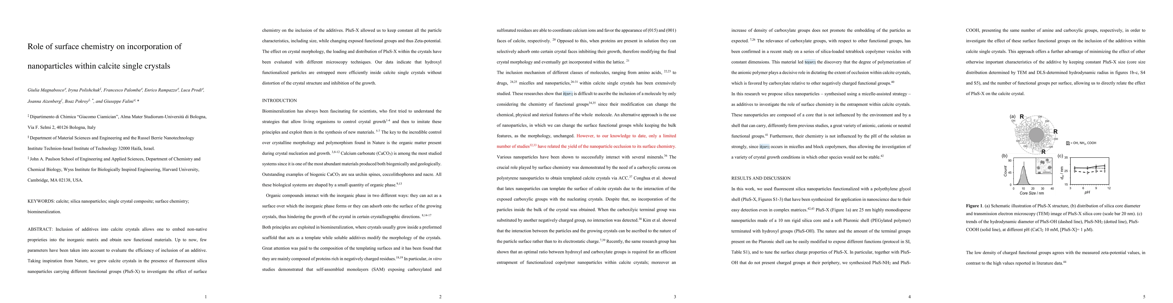 This study investigates how different surface chemistries of fluorescent silica nanoparticles influence their incorporation within calcite single crystals. Hydroxyl functionalized nanoparticles are found to be more efficiently embedded without altering the crystal structure or growth, highlighting the role of surface chemistry in nanoparticle inclusion.