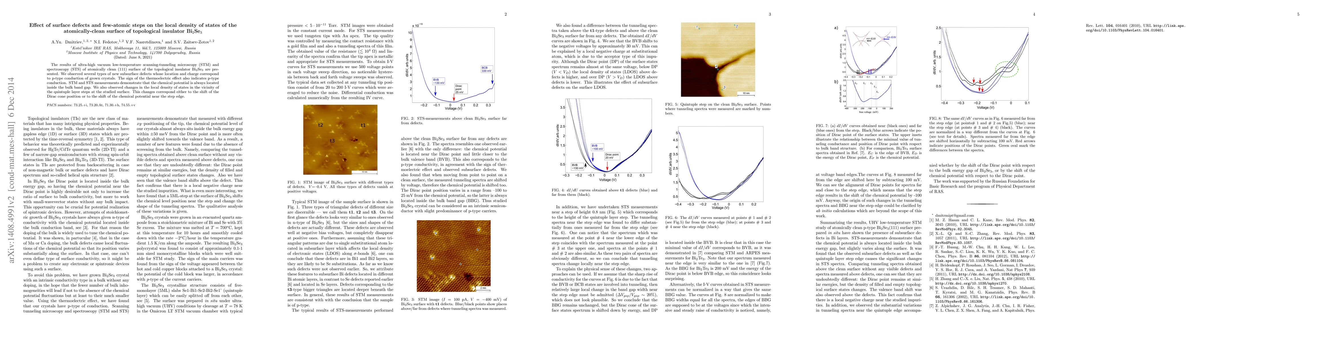 The results of ultra-high vacuum low-temperature scanning-tunneling microscopy (STM) and spectroscopy (STS) of atomically clean (111) surface of the topological insulator Bi$_2$Se$_3$ are presented. We observed several types of new subsurface defects whose location and charge correspond to p-type conduction of grown crystals. The sign of the thermoelectric effect also indicates p-type conduction. STM and STS measurements demonstrate that the chemical potential is always located inside the bulk band gap. We also observed changes in the local density of states in the vicinity of the quintuple layer steps at the studied surface. This changes correspond either to the shift of the Dirac cone position or to the shift of the chemical potential near the step edge.