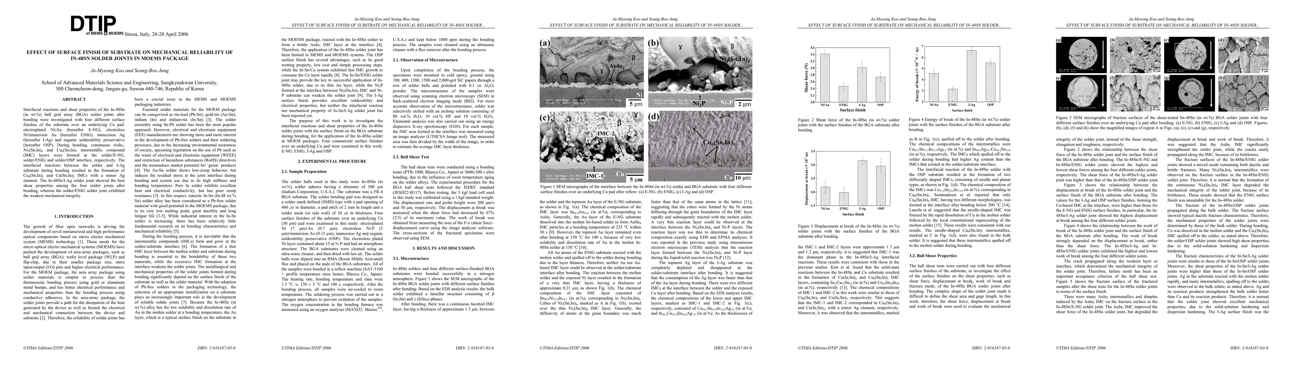 This study investigates the mechanical reliability of In-48Sn solder joints in MEMS packages with four different substrate surface finishes: electroplated Ni/Au, electroless Ni/immersion Au, immersion Ag, and organic solderability preservative. The In-48Sn/immersion Ag solder joint demonstrated superior shear properties, while the electroless Ni/immersion Au solder joint showed the weakest mechanical integrity.