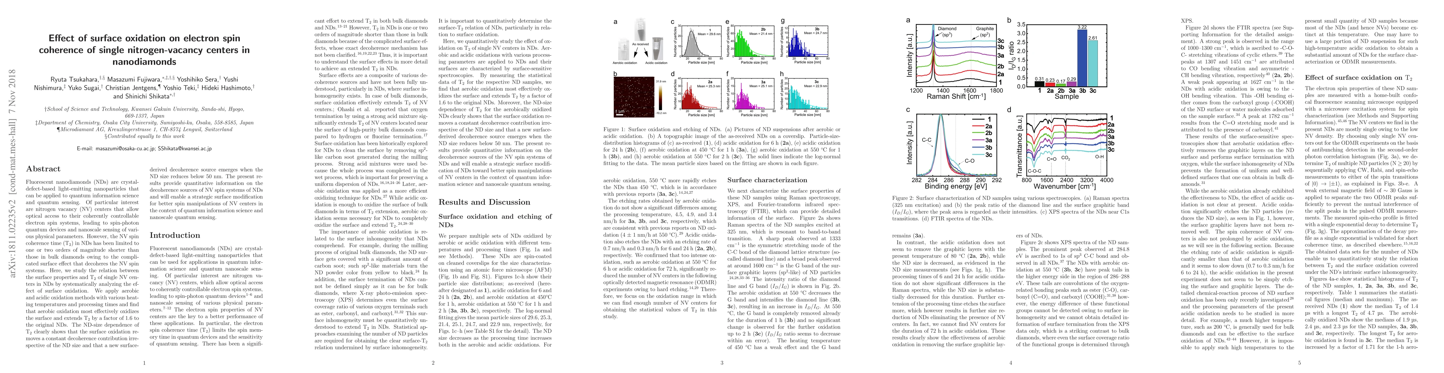 This paper investigates how surface oxidation affects the electron spin coherence of nitrogen-vacancy (NV) centers in nanodiamonds (NDs), finding that aerobic oxidation extends the NV spin coherence time (T2) by a factor of 1.6. The study reveals that surface oxidation reduces a constant decoherence source, but introduces new decoherence when ND size falls below 50 nm.
