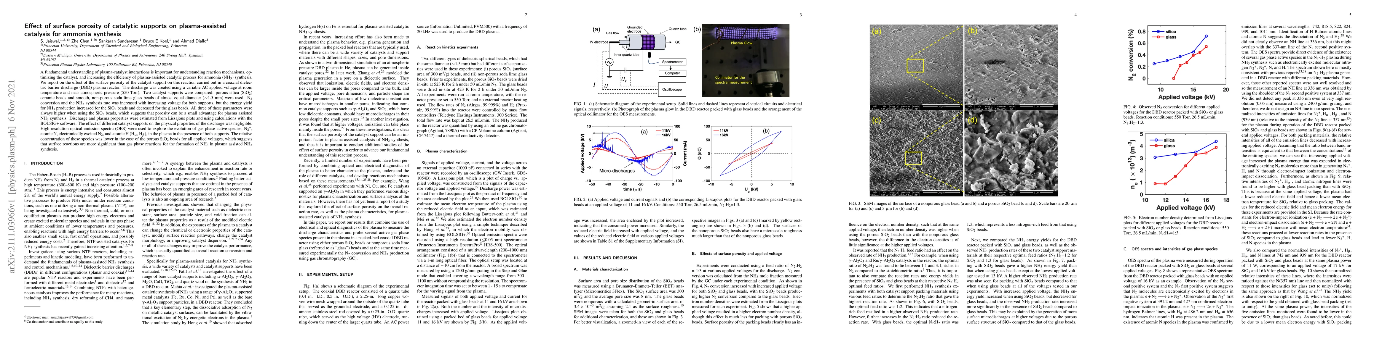 A fundamental understanding of plasma-catalyst interactions is important for understanding reaction mechanisms, optimizing the catalyst, and increasing the efficiency of plasma-assisted catalytic process for ammonia (\ce{NH3}) synthesis. We report on the effect of the surface porosity of the catalyst support on this reaction carried out in a coaxial dielectric barrier discharge (DBD) plasma reactor. The discharge was created using a variable AC applied voltage at room temperature and near atmospheric pressure (550 Torr). Two catalyst supports were compared: porous silica (\ce{SiO2}) ceramic beads and smooth, non-porous soda lime glass beads of almost equal diameter ($\sim$1.5 mm) were used. \ce{N2} conversion and the \ce{NH3} synthesis rate was increased with increasing voltage for both supports, but the energy yield for \ce{NH3} production increased for the \ce{SiO2} beads and decreased for the glass beads. All three of these parameters were always higher when using the \ce{SiO2} beads, which suggests that porosity can be a small advantage for plasma assisted \ce{NH3} synthesis. Discharge and plasma properties were estimated from Lissajous plots and using calculations with the BOLSIG+ software. The effect of different catalyst supports on the physical properties of the discharge was negligible. High resolution optical emission spectra (OES) were used to explore the evolution of gas phase active species, \ce{N2+}, atomic N, electronically excited \ce{N2}, and atomic H (H$_\alpha$, H$_\beta$), in the plasma in the presence of both supports. The relative concentration of these species was lower in the case of the porous \ce{SiO2} beads for all applied voltages, which suggests that surface reactions are more significant than gas phase reactions for the formation of \ce{NH3} in plasma assisted \ce{NH3} synthesis.