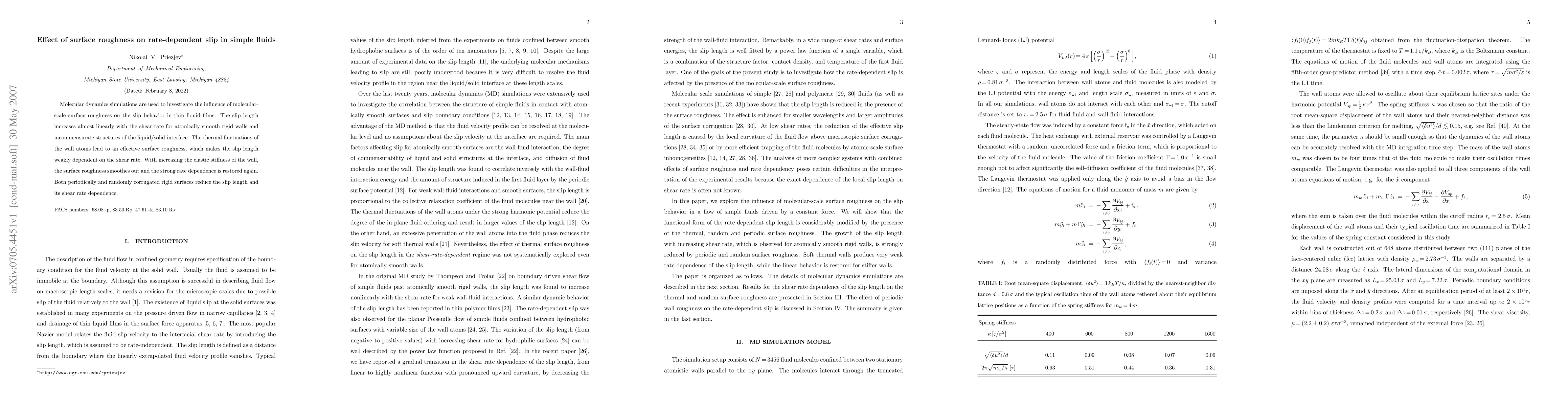 Molecular dynamics simulations are used to investigate the influence of molecular-scale surface roughness on the slip behavior in thin liquid films. The slip length increases almost linearly with the shear rate for atomically smooth rigid walls and incommensurate structures of the liquid/solid interface. The thermal fluctuations of the wall atoms lead to an effective surface roughness, which makes the slip length weakly dependent on the shear rate. With increasing the elastic stiffness of the wall, the surface roughness smoothes out and the strong rate dependence is restored again. Both periodically and randomly corrugated rigid surfaces reduce the slip length and its shear rate dependence.