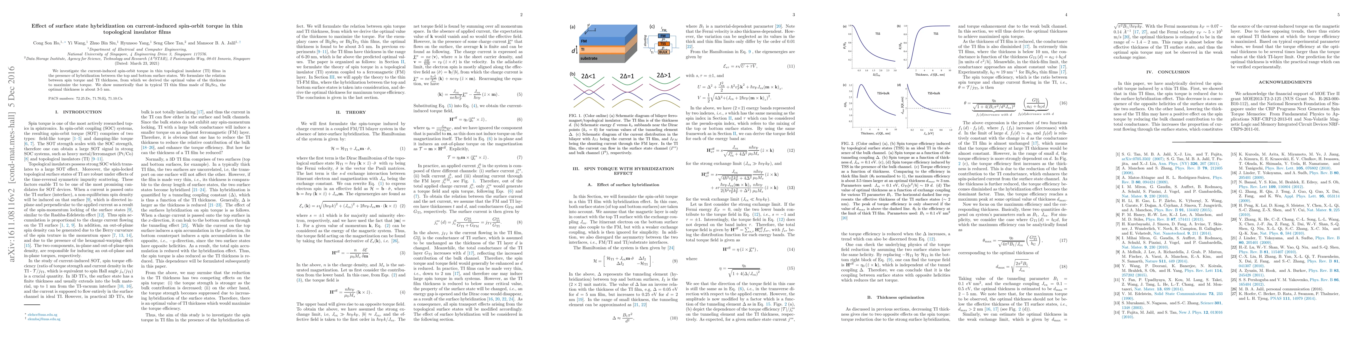 This study explores the impact of surface state hybridization on current-induced spin-orbit torque in thin topological insulator films, determining the optimal film thickness of 3-5 nm for $\mathrm{Bi_2Se_3}$ to maximize torque. Numerical results reveal the relationship between spin torque and film thickness.