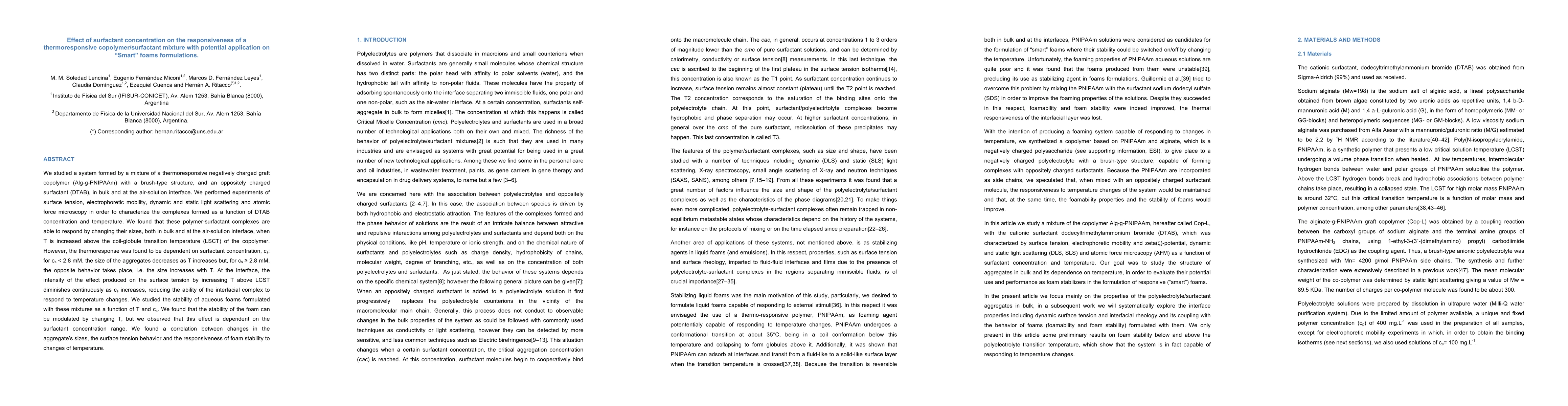 This study investigates how varying surfactant concentration affects the thermoresponsive behavior of a copolymer/surfactant mixture, finding that below 2.8 mM, aggregate size decreases with temperature, while above this threshold, size increases. The foam stability formulated with these mixtures is also temperature-dependent and modulated by surfactant concentration.