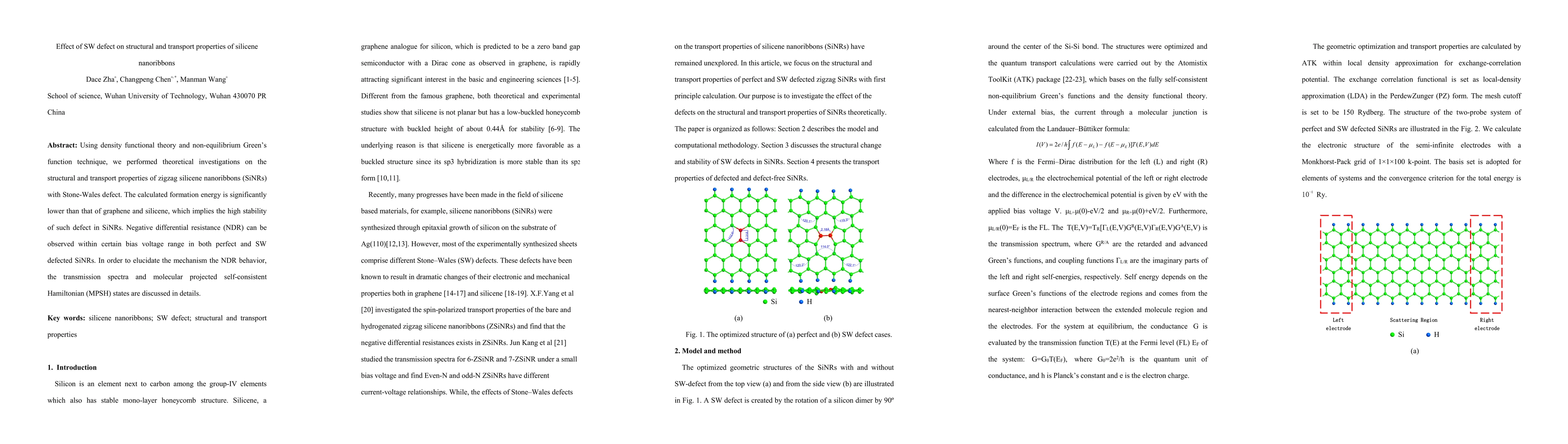Using density functional theory and non-equilibrium Greens function technique, we performed theoretical investigations on the structural and transport properties of zigzag silicene nanoribbons with Stone-Wales defect. The calculated formation energy is significantly lower than that of graphene and silicene, which implies the high stability of such defect in SiNRs. Negative differential resistance can be observed within certain bias voltage range in both perfect and SW defected SiNRs. In order to elucidate the mechanism the NDR behavior,the transmission spectra and molecular projected self-consistent Hamiltonian states are discussed in details.
