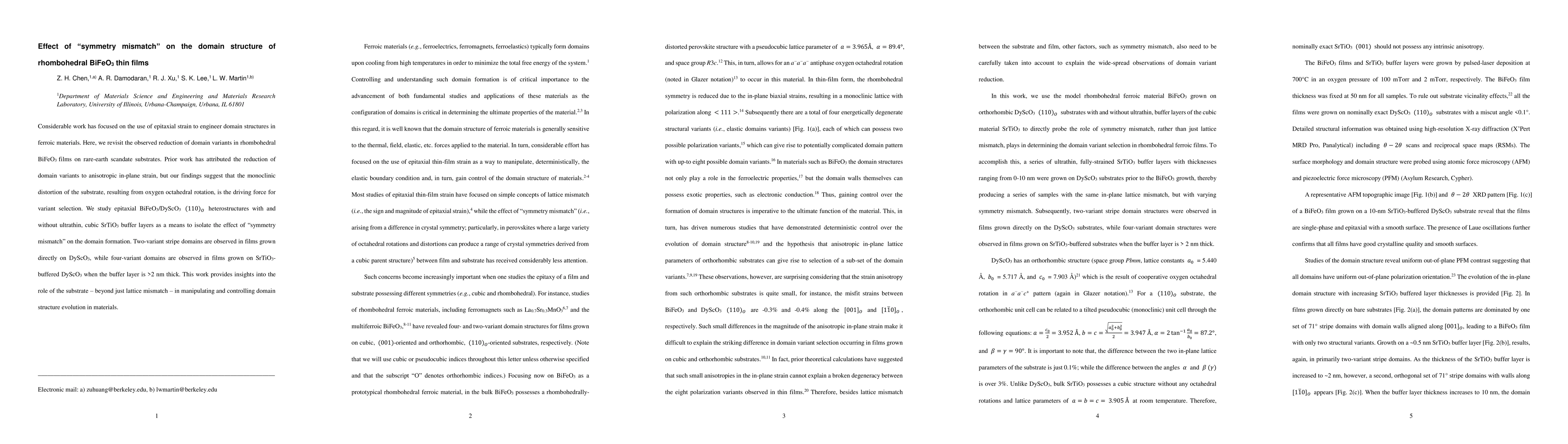 This study explores how symmetry mismatch between rhombohedral BiFeO3 thin films and DyScO3 substrates influences domain structure, finding that monoclinic distortion from substrate rotation, rather than in-plane strain, drives domain variant selection. Films on DyScO3 show two-variant domains, while thicker SrTiO3 buffer layers induce four-variant domains.