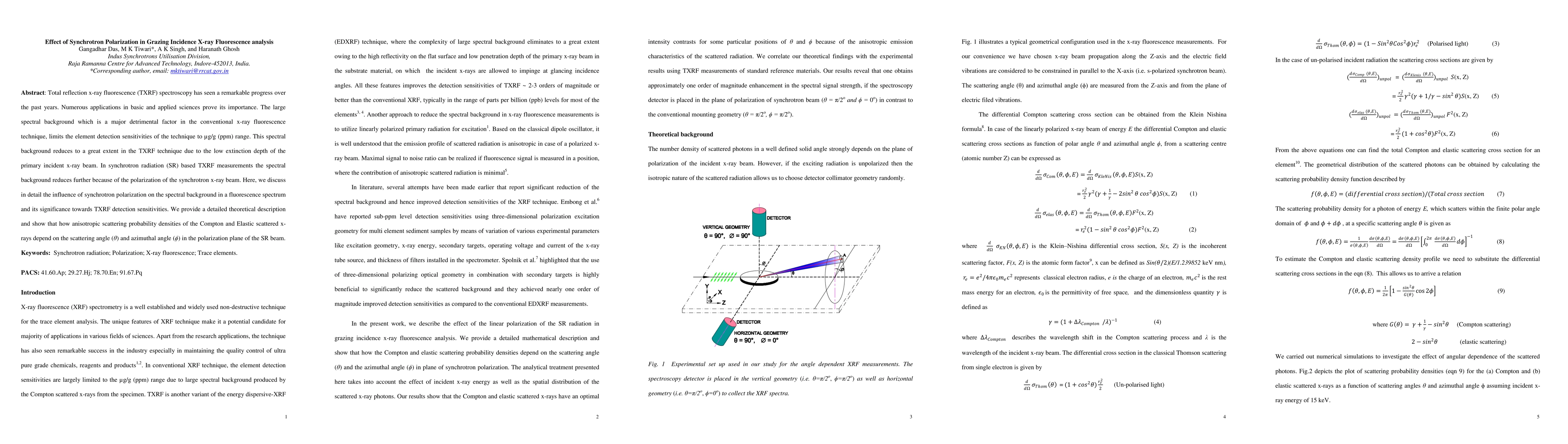 This paper investigates the impact of synchrotron polarization on the spectral background in grazing incidence X-ray fluorescence analysis, demonstrating how it enhances detection sensitivities in total reflection x-ray fluorescence (TXRF) spectroscopy by reducing the spectral background. It provides a theoretical framework to understand the anisotropic scattering of Compton and elastic scattered x-rays influenced by the synchrotron beam's polarization.